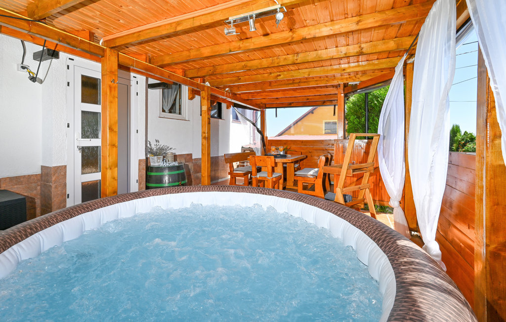 Bien-être à l'extérieur : Location de vacances disposant de chaises-longues et d'un ou plusieurs équipements tels que piscine extérieure, jacuzzi extérieur, lit à baldaquin de jardin etc...