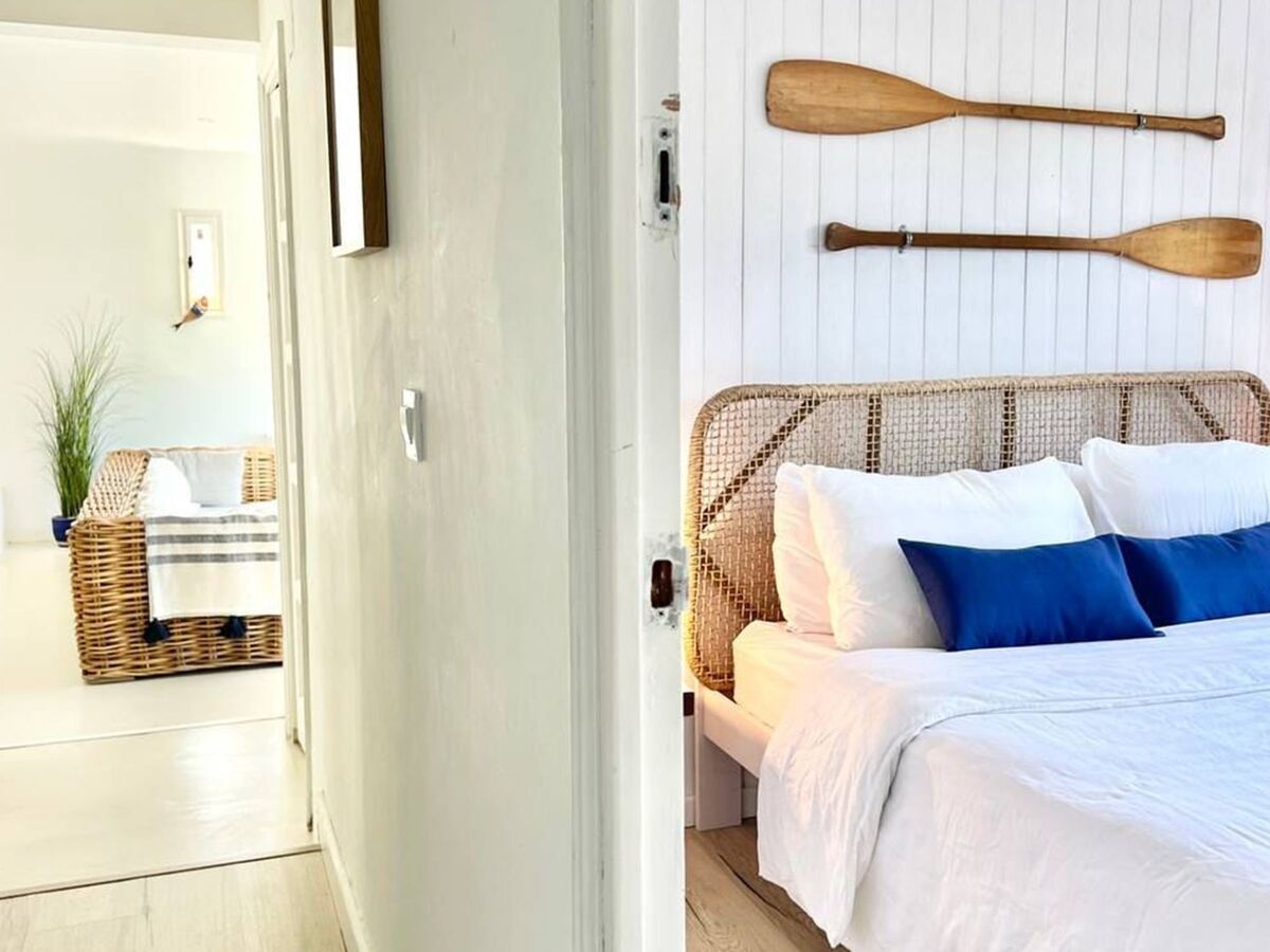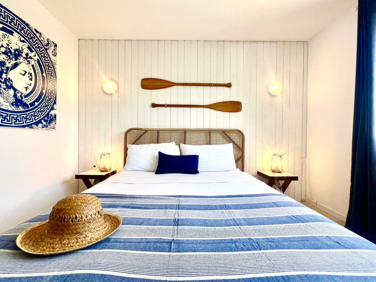 1 chambre avec 1 grand-lit (150 cm, longueur 190 cm), bain/WC et air-conditionné.