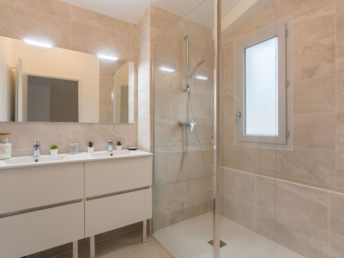 Douche, WC séparé, double vasque.