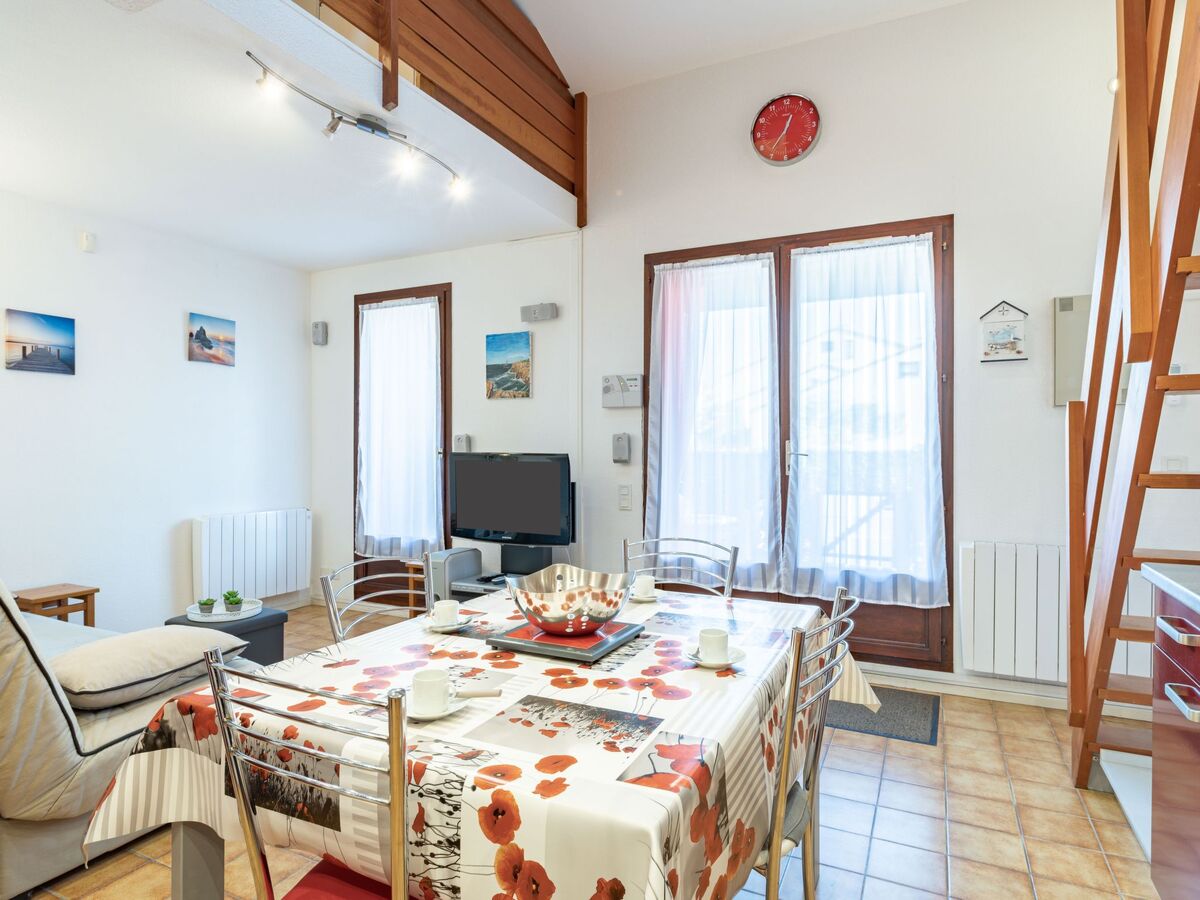 Séjour/salle à manger avec 1 divan-lit double (1 x 130 cm, longueur 190 cm), TV (écran plat), DVD et Home cinéma.
