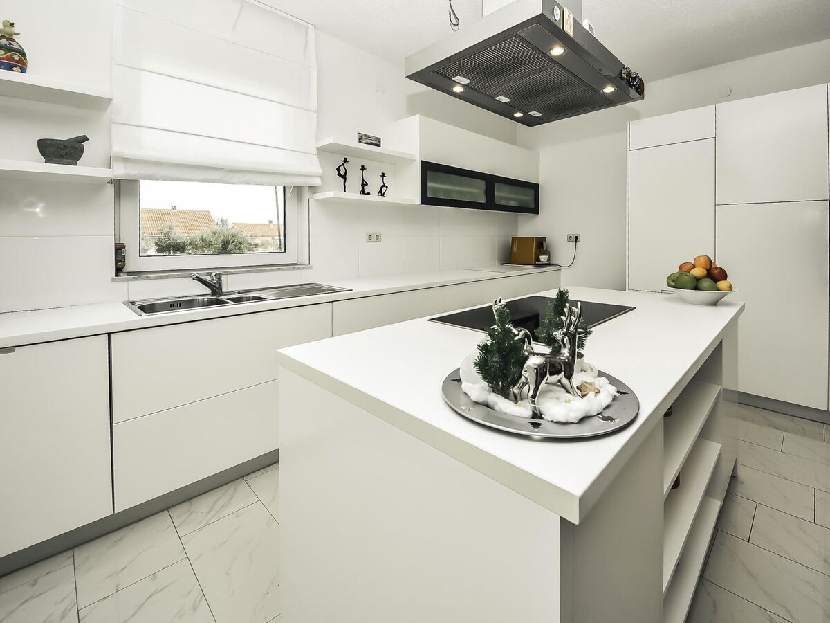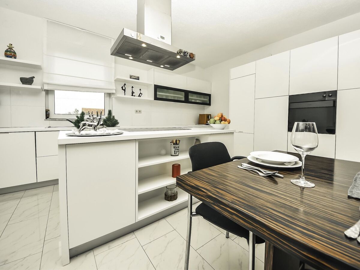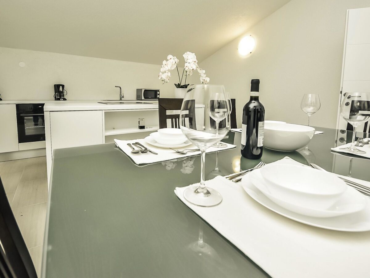 Cuisine ouverte (four, lave-vaisselle, 4 plaques vitrocéramiques, congélateur, cafetière électrique).