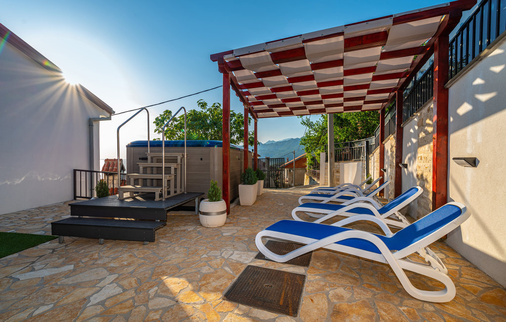 Bien-être à l'extérieur : Location de vacances disposant de chaises-longues et d'un ou plusieurs équipements tels que piscine extérieure, jacuzzi extérieur, lit à baldaquin de jardin etc...