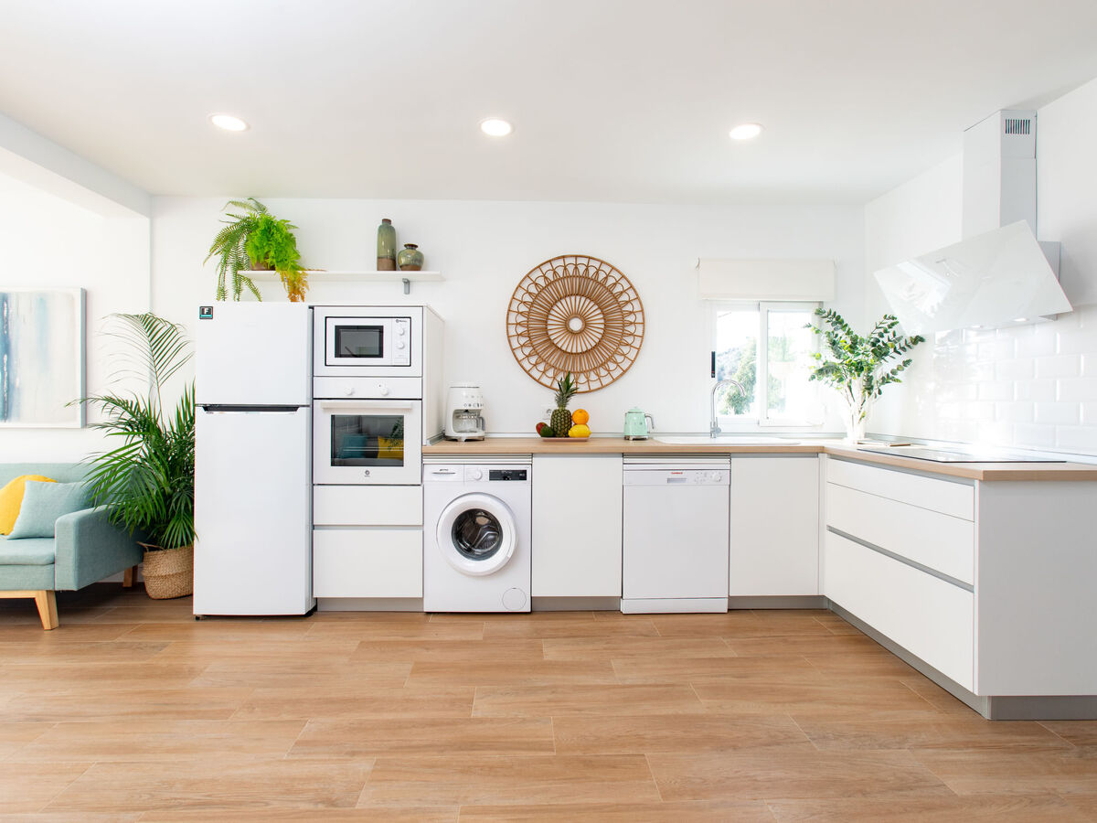 Cuisine ouverte (four, lave-vaisselle, 4 plaques vitrocéramiques, grille-pain, bouilloire électrique, micro-ondes, cafetière électrique).