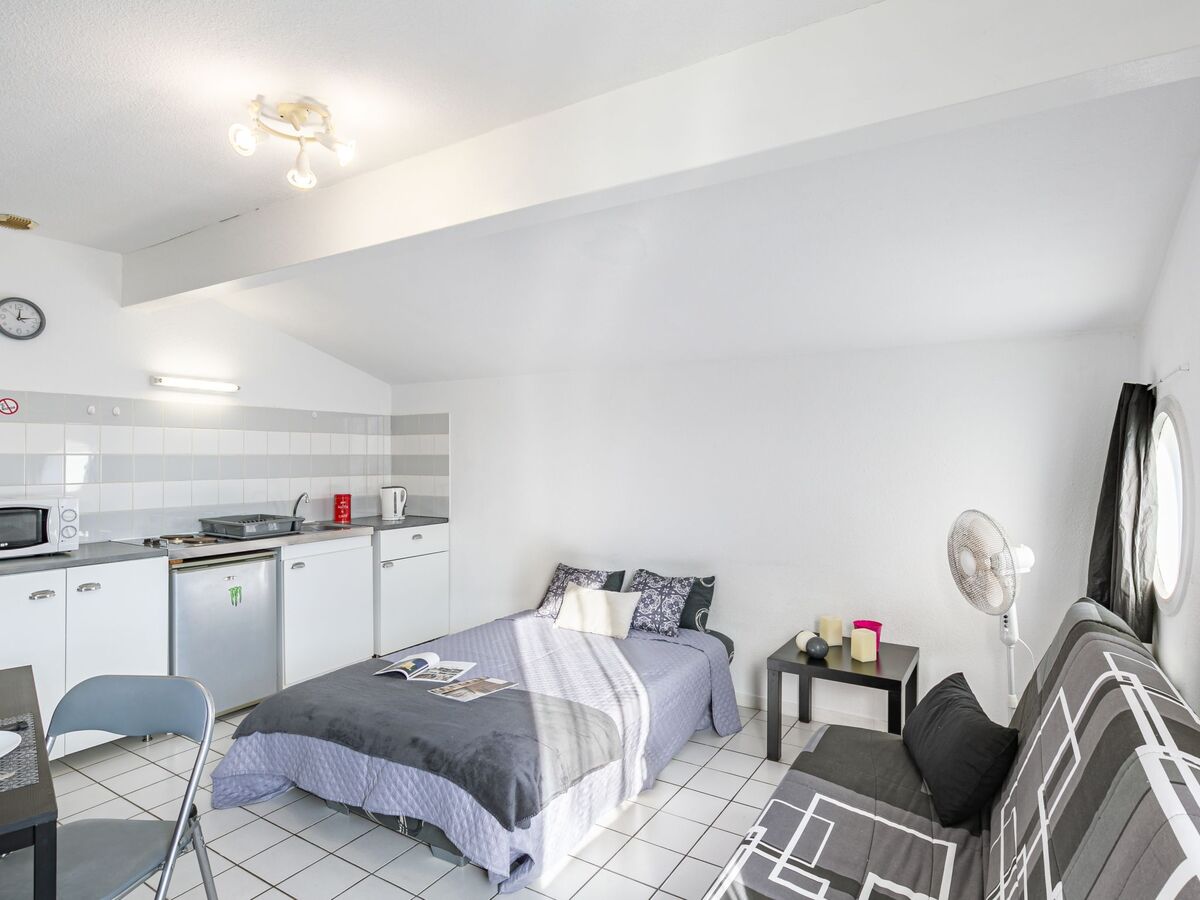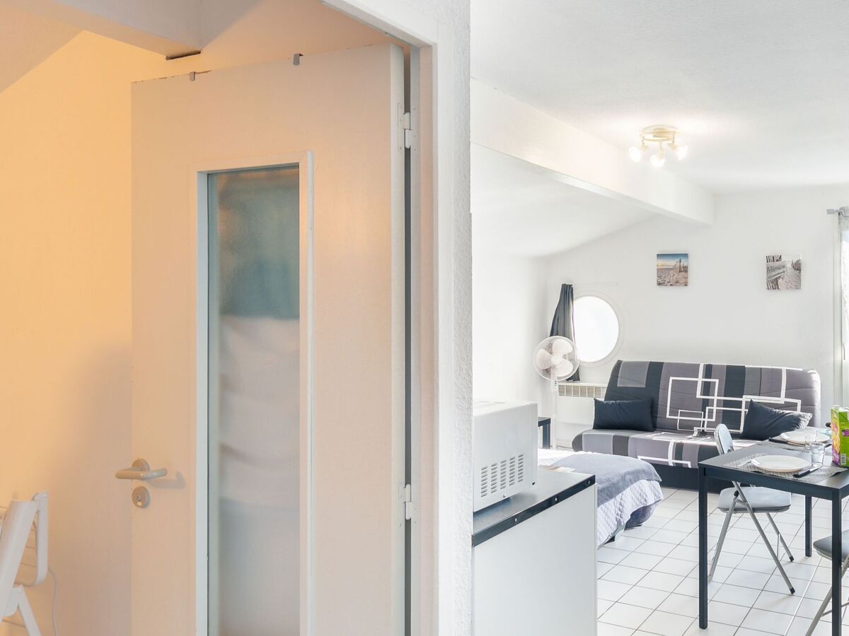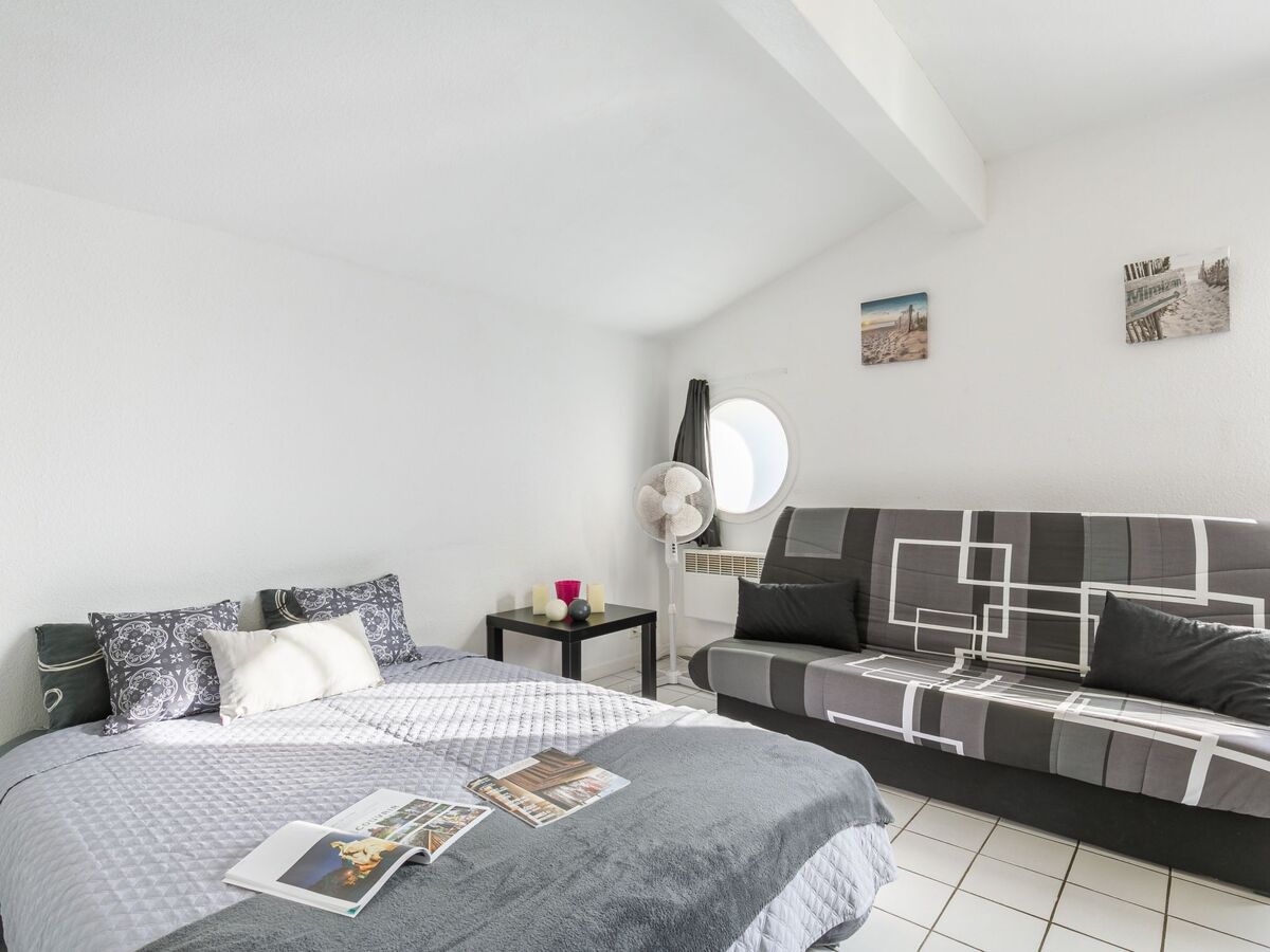 Aménagement fonctionnel: séjour/salle à manger avec 2 divans-lits (130 cm, longueur 190 cm), coin repas et TV (écran plat), radiateur électrique.