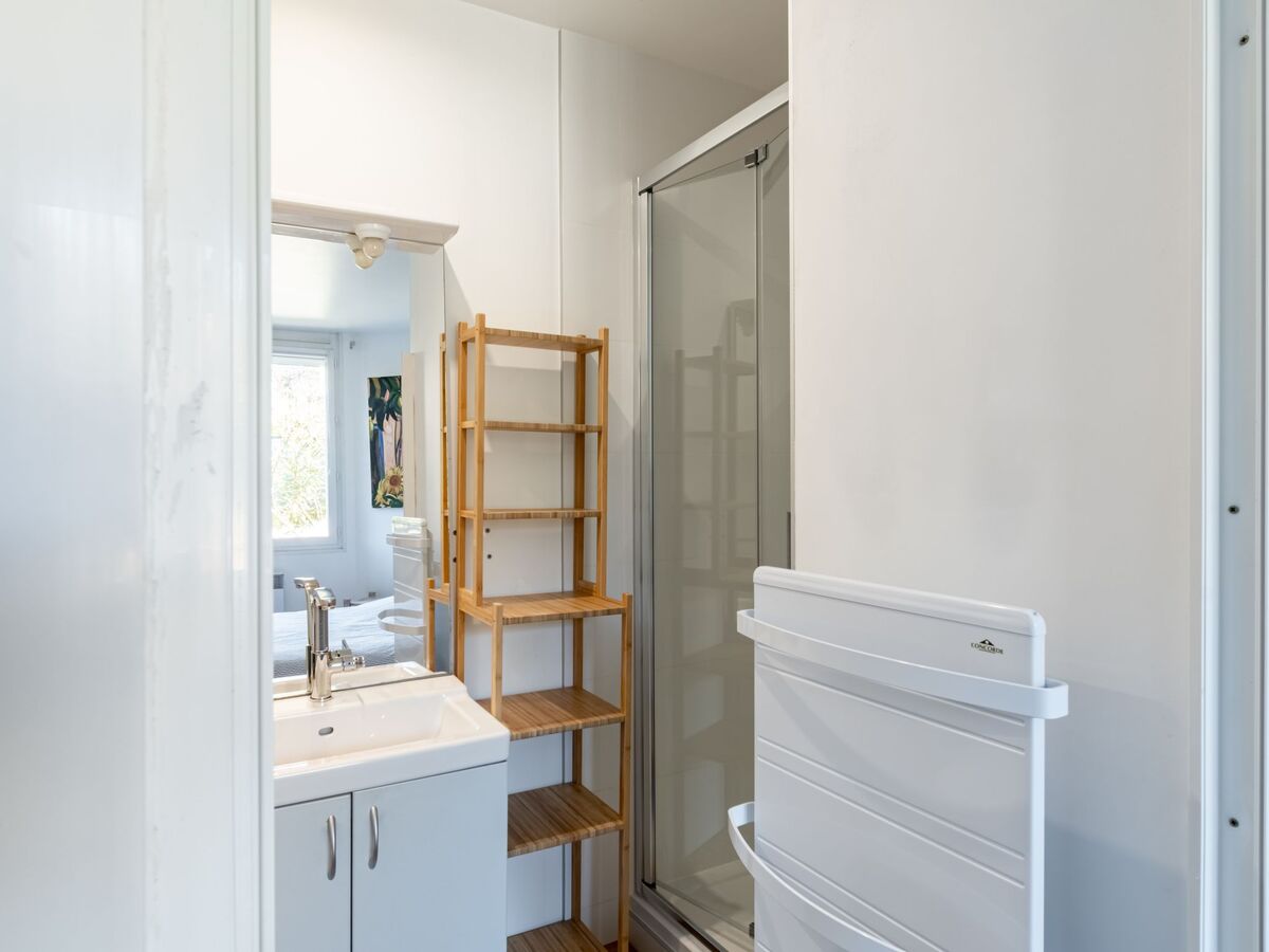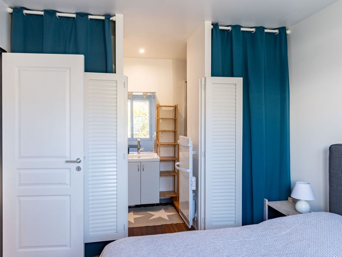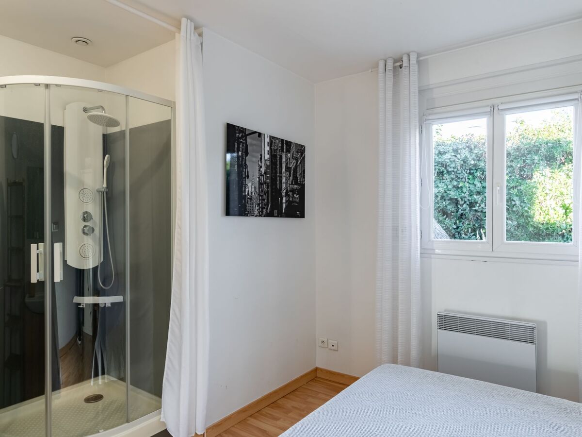 1 chambre avec 1 grand-lit (1 x 160 cm, longueur 200 cm), douche/WC.