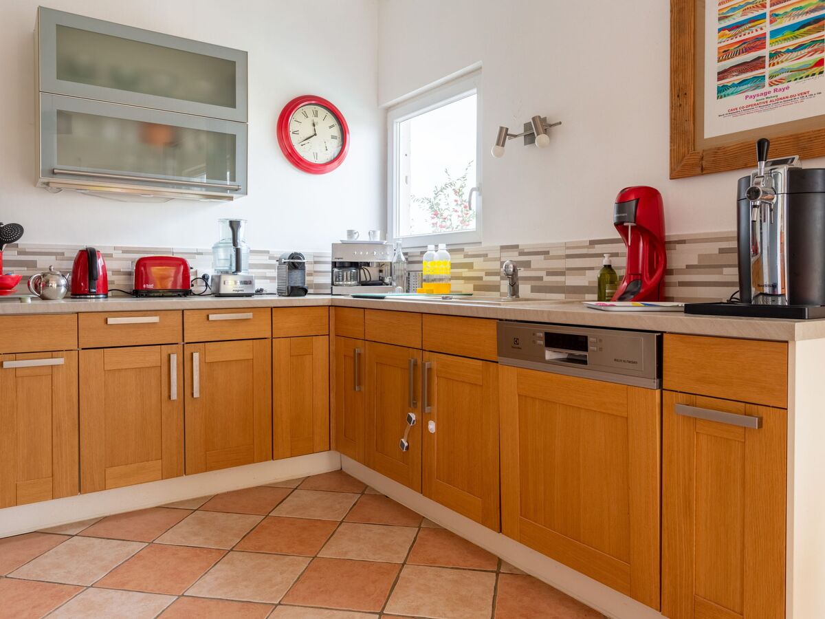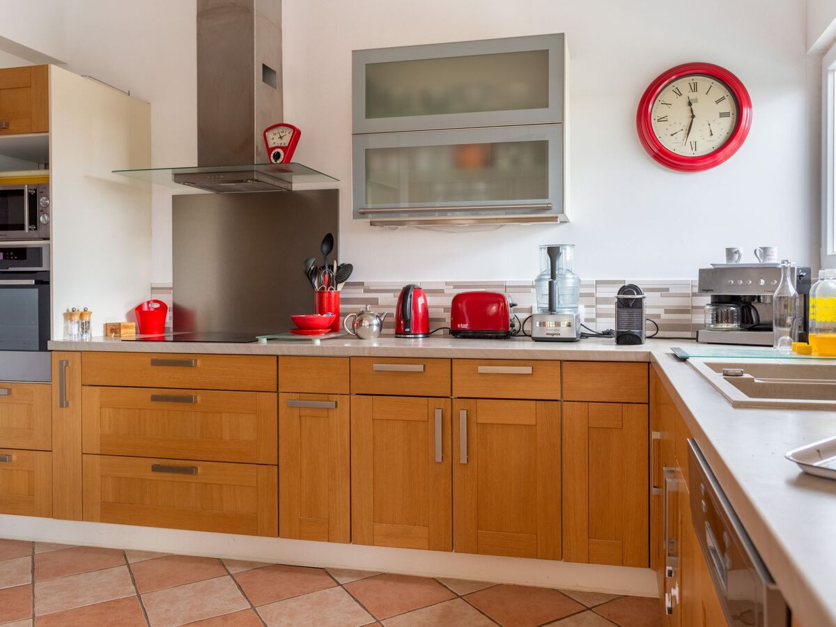 Cuisine ouverte (four, lave-vaisselle, 3 plaques à induction, grille-pain, bouilloire électrique, micro-ondes, congélateur, cafetière électrique).