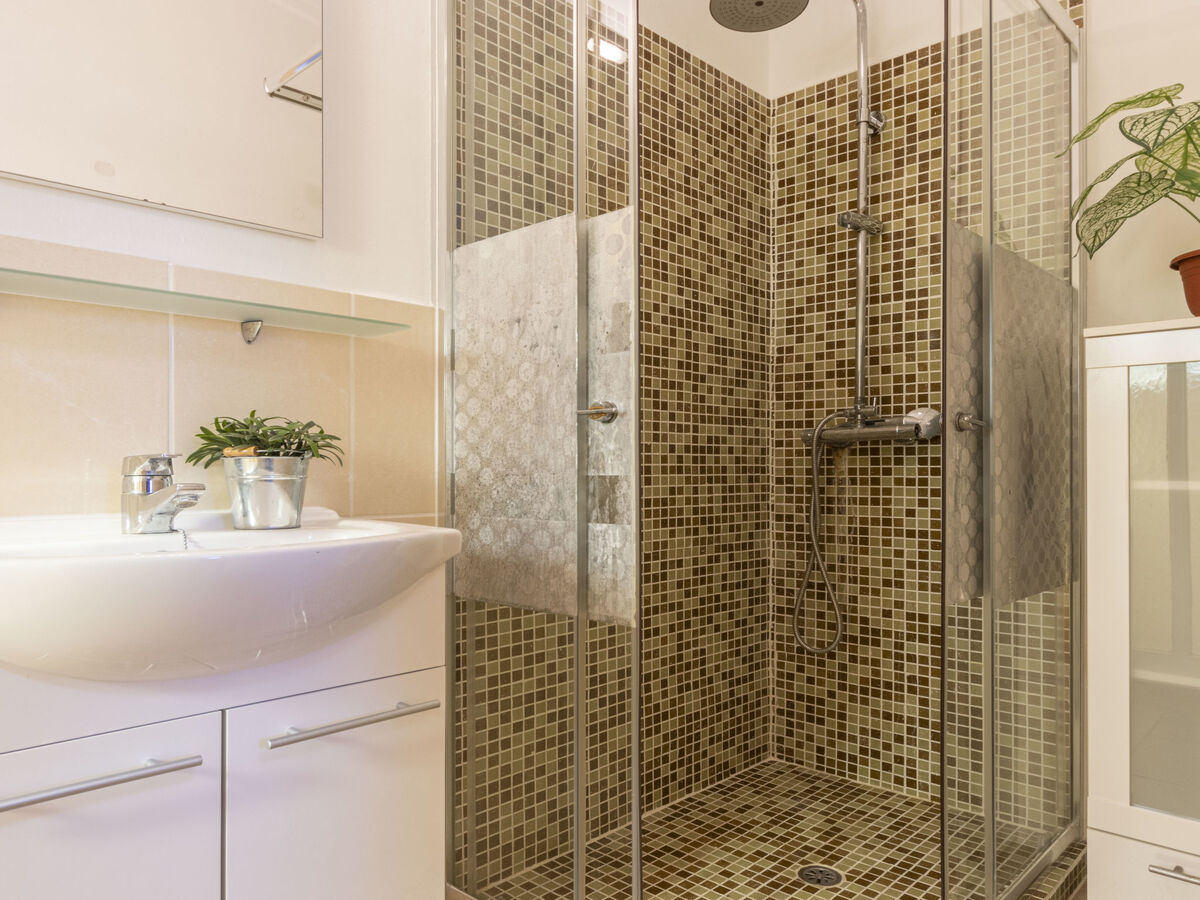 Cuisine (four, lave-vaisselle, 4 plaques vitrocéramiques, grille-pain, micro-ondes, cafetière électrique) avec douche/WC.