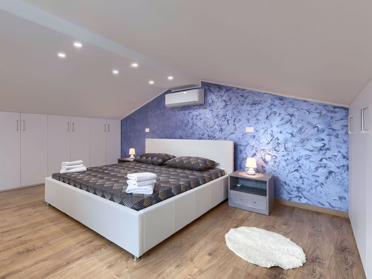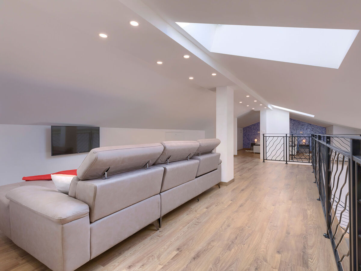 Sous le toit: galerie mansardée, ouverte, hauteur plafond 120 - 200 cm avec fenêtre sous le toit avec 1 grand-lit (180 cm, longueur 200 cm), TV (satellite) (écran plat), air-conditionné.