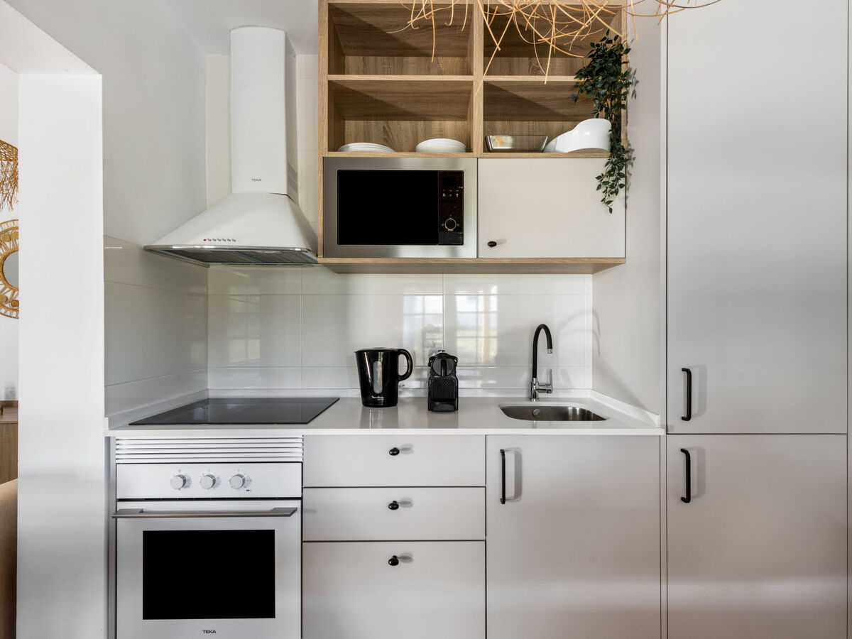 Cuisine ouverte (four, 4 plaques vitrocéramiques, grille-pain, bouilloire électrique, micro-ondes, congélateur, cafetière électrique, Capsules pour machine à café (Krups) (NON INCLUSES)).