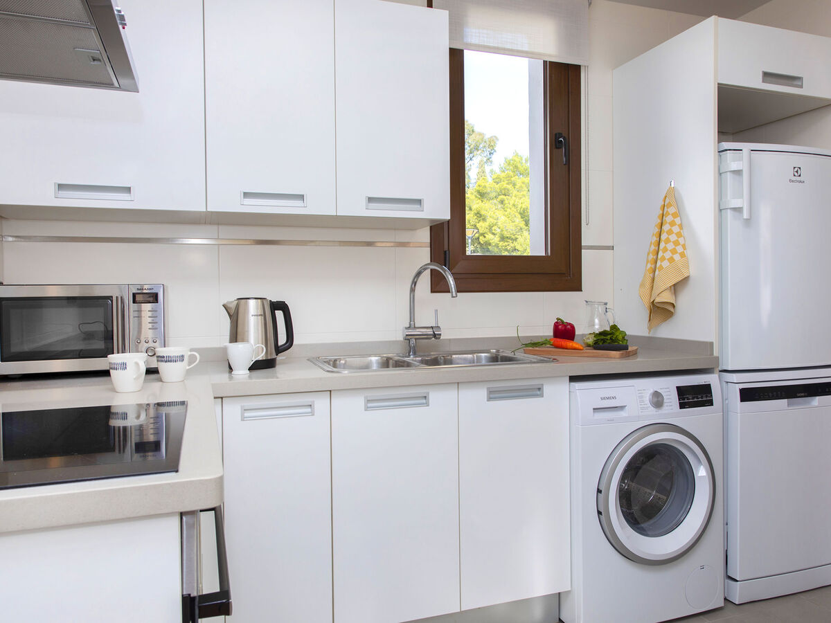 Cuisine ouverte (four, lave-vaisselle, 3 plaques à induction, grille-pain, bouilloire électrique, micro-ondes, congélateur, cafetière électrique).