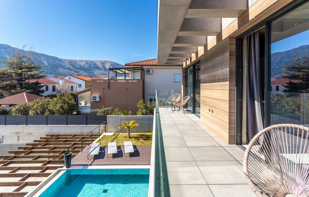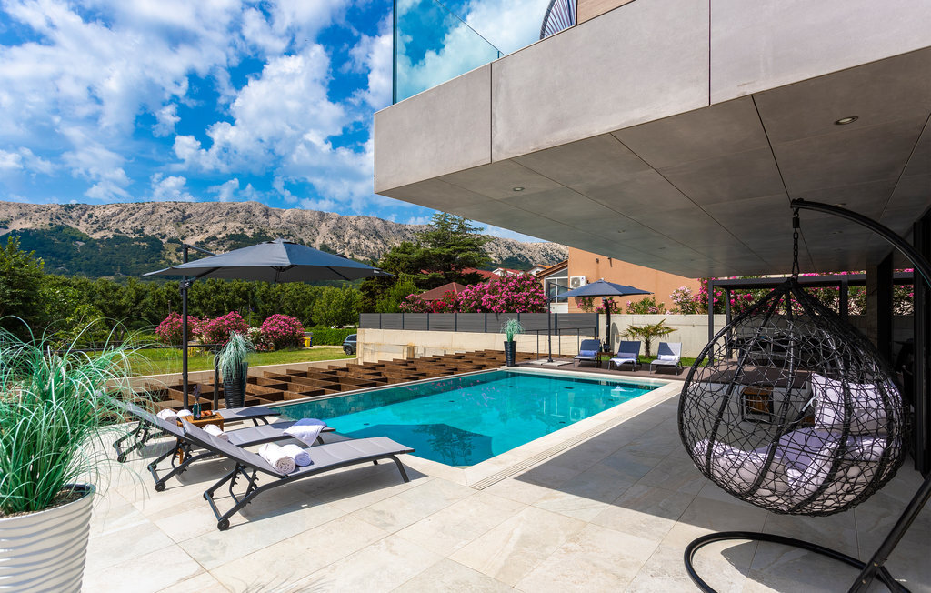 Dans cette maison de vacances luxueusement aménagée dans le style industriel, vous passerez des vacances inoubliables. La terrasse et le balcon vitré offrent une vue unique sur le paysage de l'île de Krk. Vous pourrez barboter et vous rafraîchir en famille dans la piscine à plusieurs niveaux. L'aménagement très moderne de la maison vous offre tout ce dont vous avez besoin pour passer des vacances agréables. Au sous-sol, vous trouverez un sauna et un jacuzzi, ainsi qu'un espace fitness et un home cinéma. Un endroit magnifique pour se détendre ! Grâce au chauffage par le sol, la maison est adaptée à une visite en toutes saisons. Après une journée bien remplie, savourez une boisson rafraîchissante sur la terrasse au bord de la piscine. Vous y trouverez des places ensoleillées et ombragées sur les chaises longues et les chaises suspendues confortables.