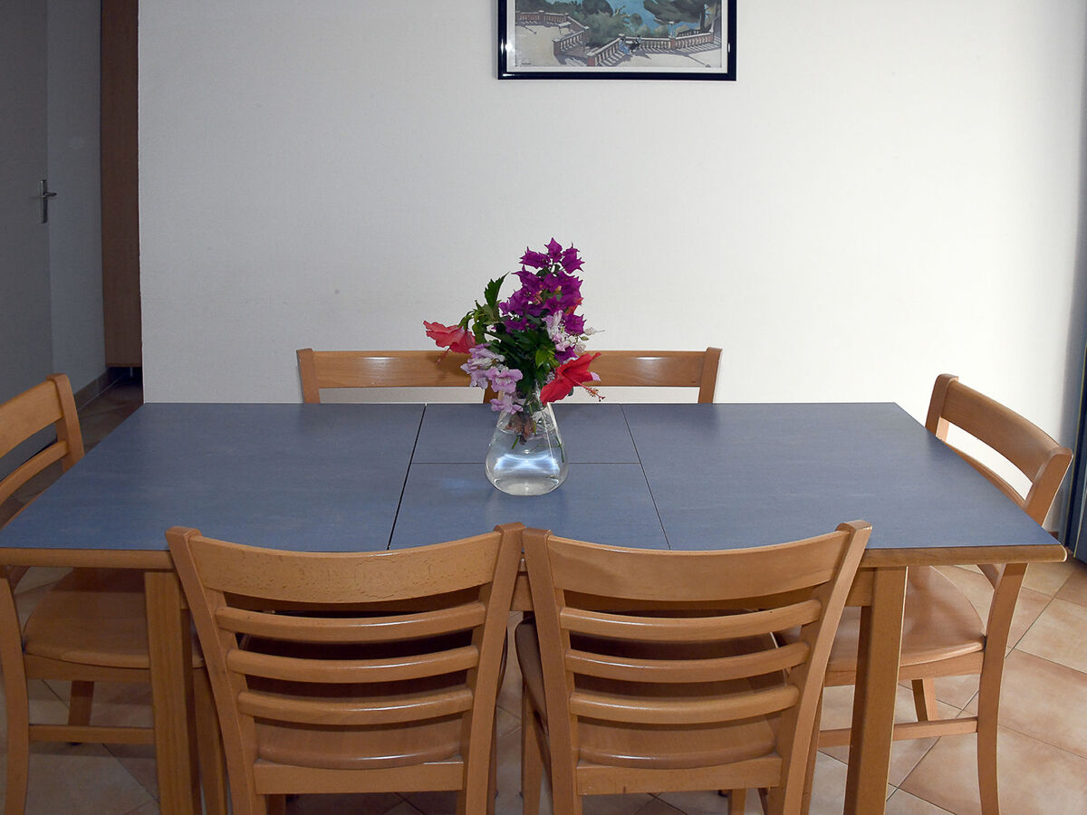 Aménagement fonctionnel: séjour/salle à manger avec 1 divan-lit double (140 cm, longueur 190 cm), TV (écran plat).