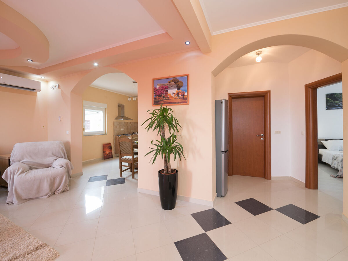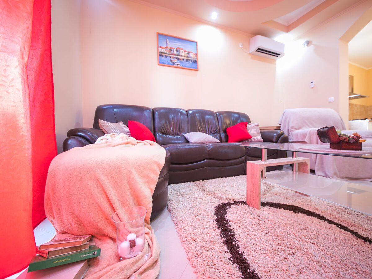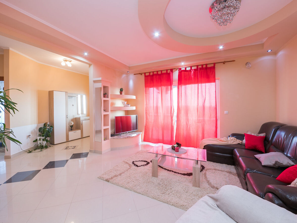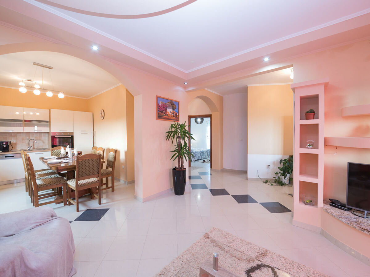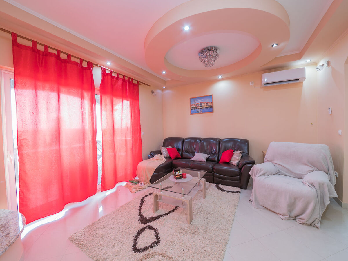 Séjour/salle à manger 35 m2 avec 1 divan-lit double (138 cm, longueur 190 cm), TV (satellite) et air-conditionné.