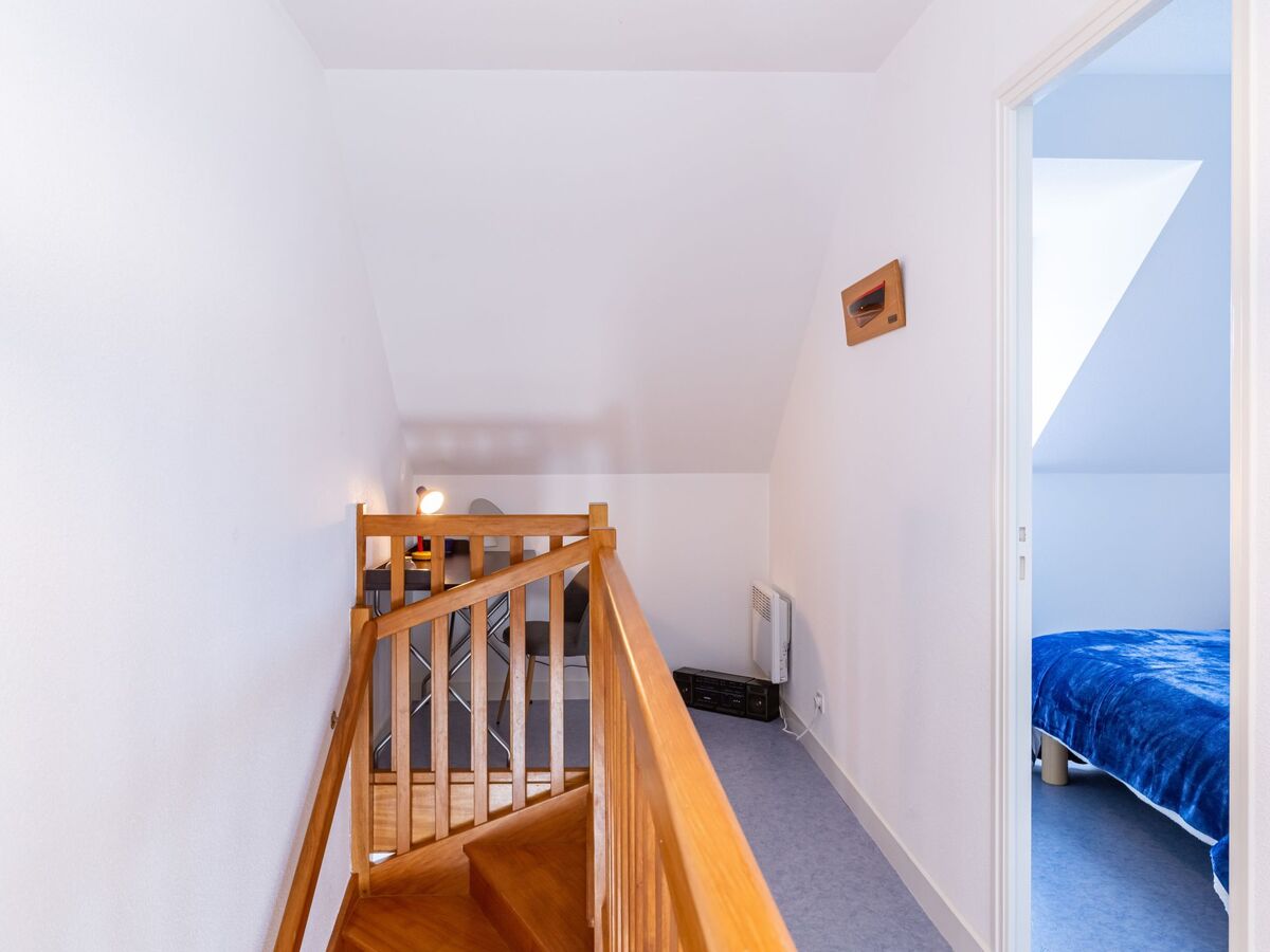 À l'étage supérieur: 1 chambre, mansardée avec 1 grand-lit (140 cm, longueur 190 cm).
