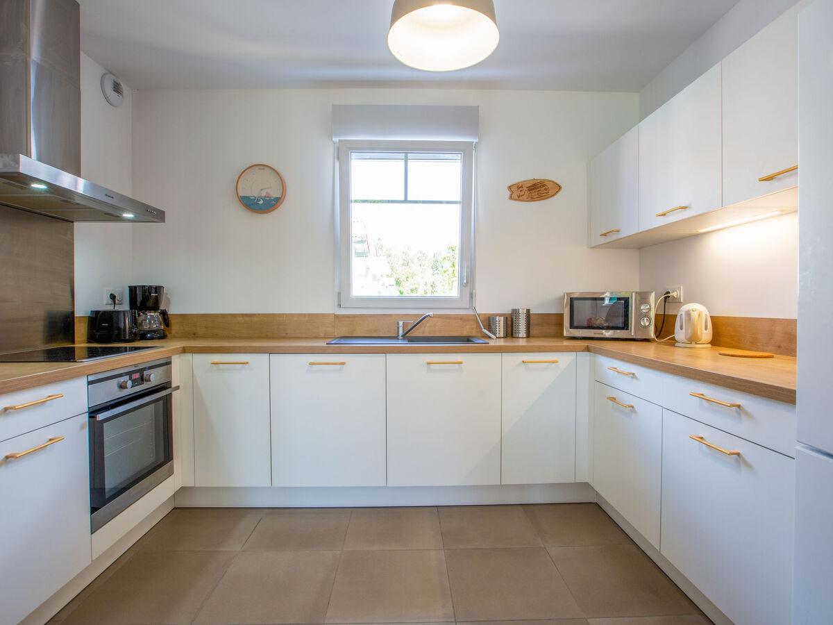Cuisine ouverte (four, lave-vaisselle, 4 plaques à induction, grille-pain, bouilloire électrique, micro-ondes, congélateur, cafetière électrique).