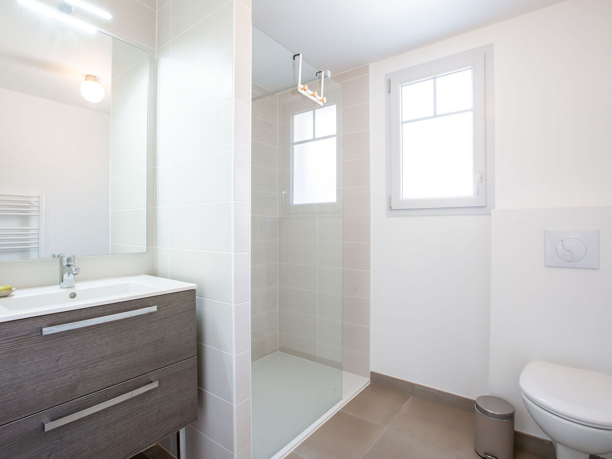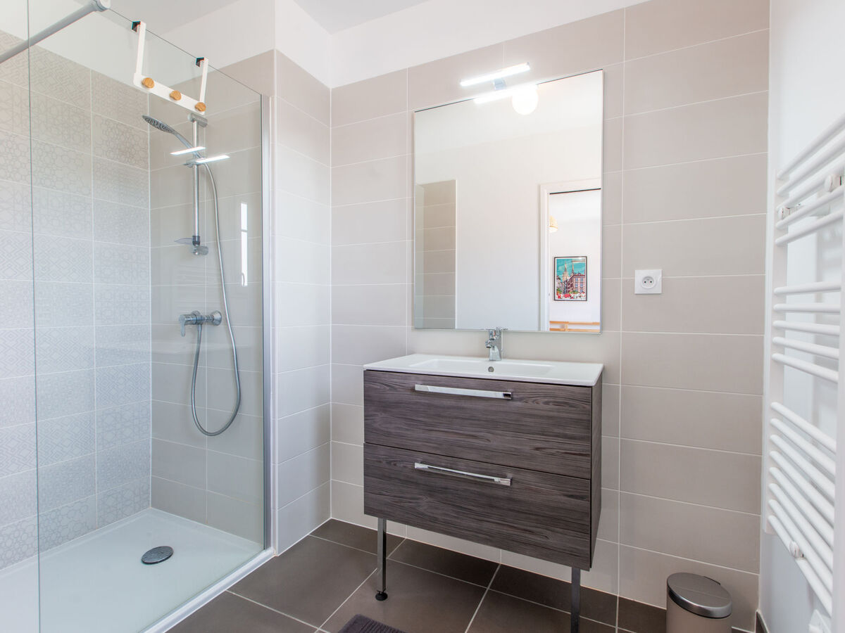 À l'étage supérieur: 1 chambre avec 1 grand-lit (160 cm, longueur 200 cm), douche.