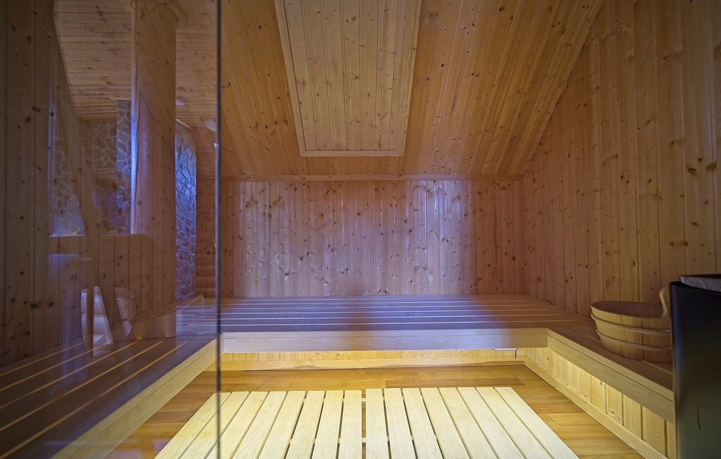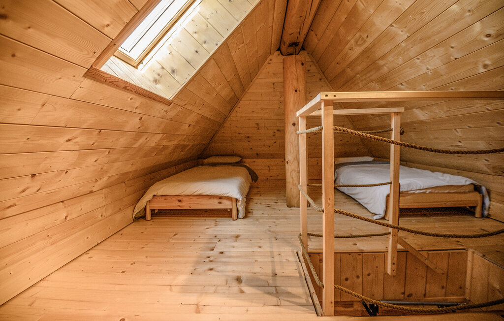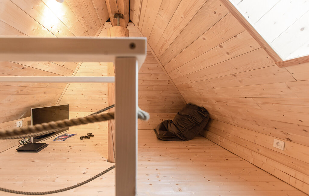 De nombreux éléments en bois dominent l'aménagement - notamment les troncs d'arbres ronds qui donnent l'impression d'une maison en rondins. De la niche de télévision sous le toit pointu à la grande terrasse en pente avec piscine, en passant par le sauna et le salon merveilleusement confortable avec cheminée, vous trouverez un équipement unique et de qualité. Dans cette ambiance, vous pouvez vraiment vous faire plaisir et vous sentir à tout moment très proche de la nature.
