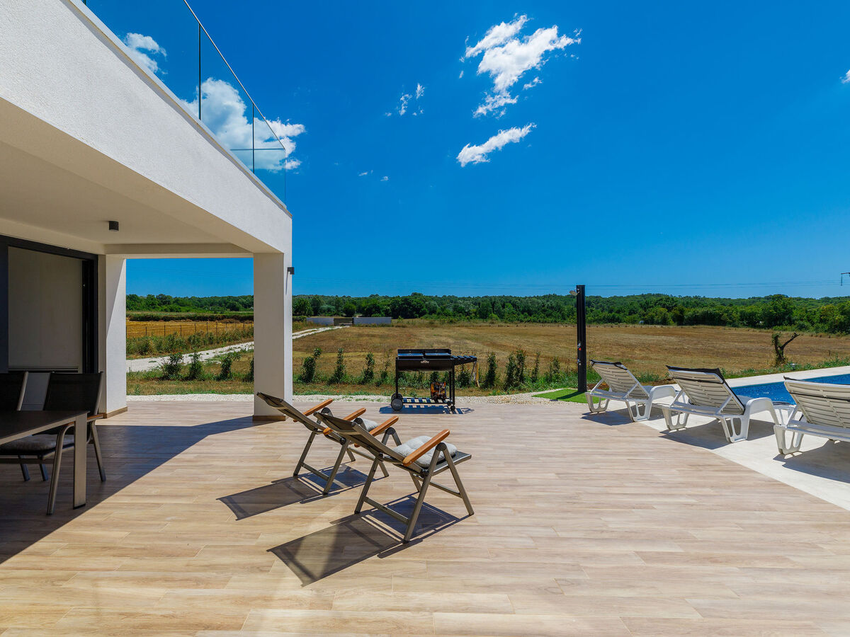 Meubles de terrasse, barbecue (portable), chaises longues.