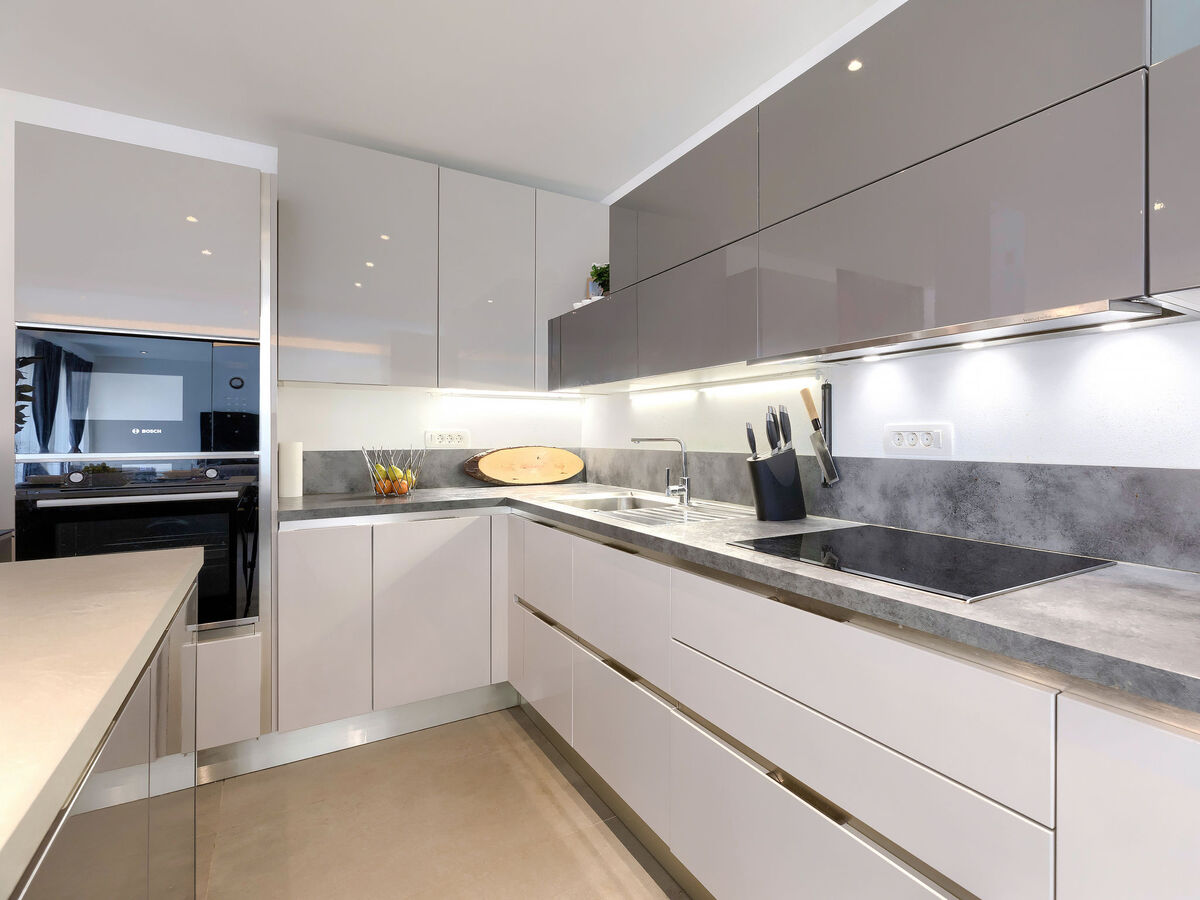 Cuisine ouverte (four, lave-vaisselle, 4 plaques vitrocéramiques, bouilloire électrique, micro-ondes, congélateur).