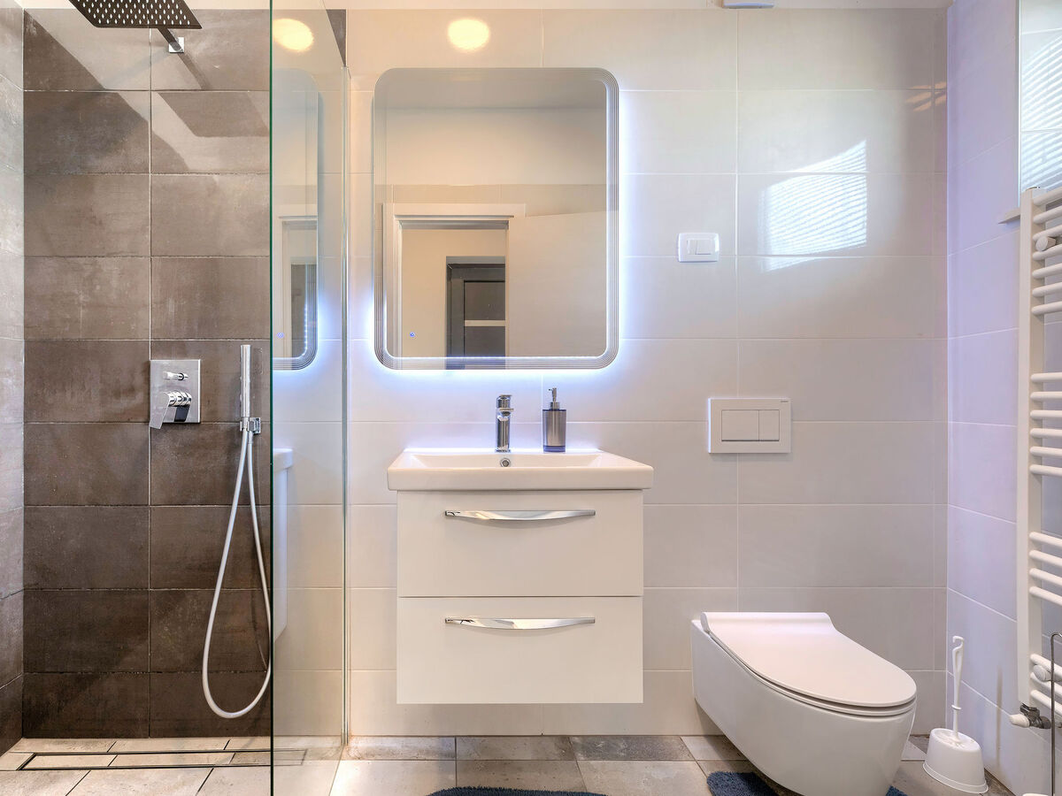 Douche extérieure, meubles de jardin, barbecue, espace de jeux pour les enfants (balançoire).