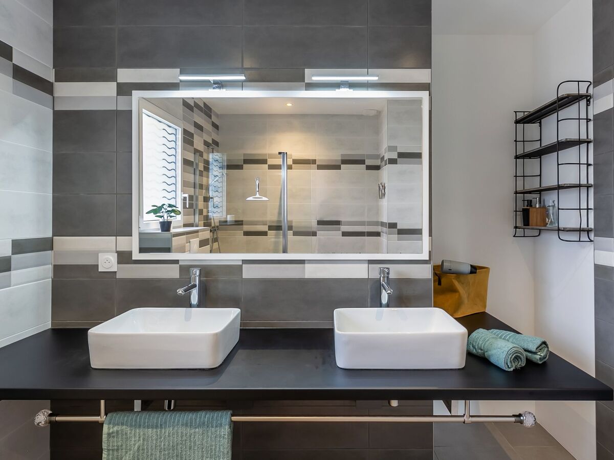 Cuisine ouverte (four, lave-vaisselle, 4 plaques à induction, grille-pain, bouilloire électrique, micro-ondes, congélateur, cafetière électrique).