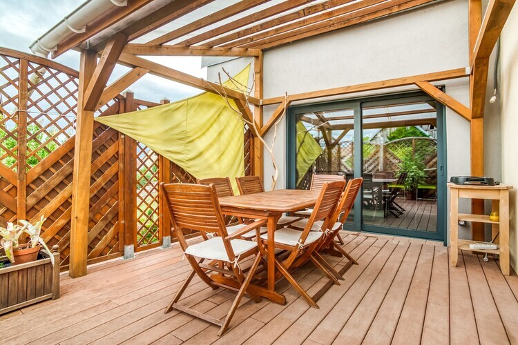 Rez-de-chaussée: (salle à manger(TV, table), cuisine(robinet d'eau bouillante, grille-pain, plaque de cuisson, hotte, cafetière/percolateur, four, micro ondes, combinaison réfrigérateur/congélateur), chambre(lit double), salle de bains(baignoire, Bain à bulles, lavabo), WC(douche, lavabo, WC), balcon ou terrasse) Au 1er étage: (chambre(Lit superposé), chambre(lit simple)) terrasse, barbecue(électrique)