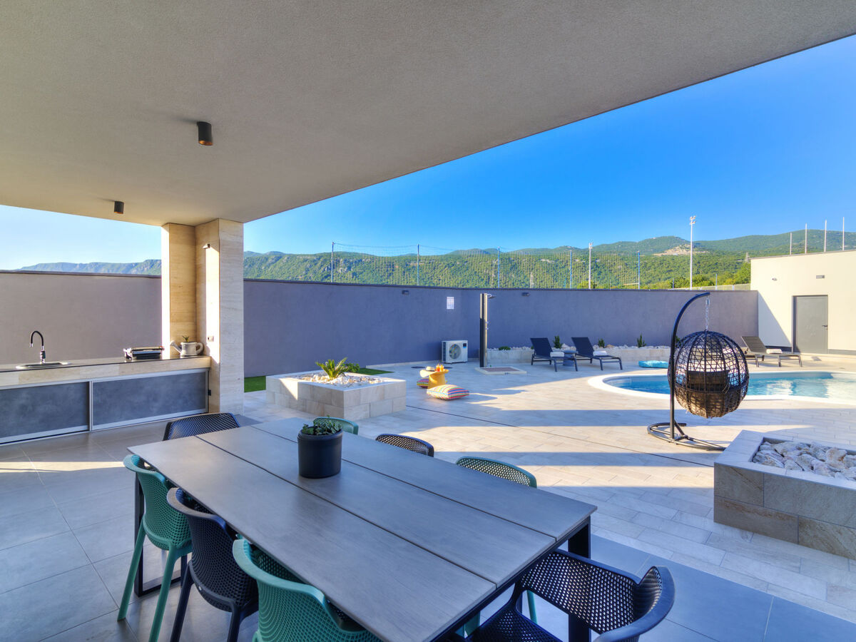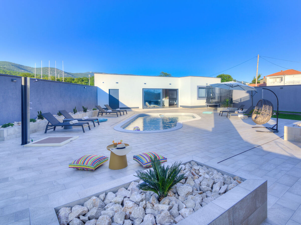 A usage privé: terrain 700 m2 (clôturé) avec pelouse et plantes, piscine chauffée (30 m2, profondeur 150 cm, disponibilité saisonnière: 15.Mar.