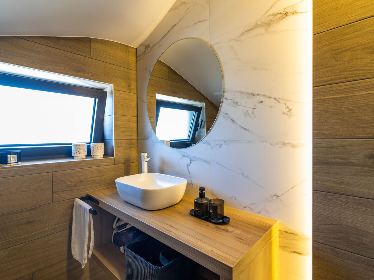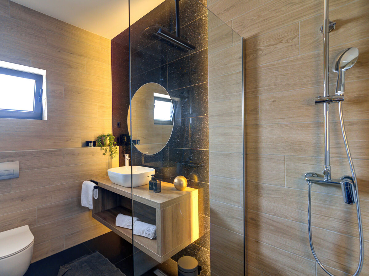 À l'étage supérieur: 1 chambre avec 1 divan-lit (90 cm, longueur 200 cm), 1 grand-lit (180 cm, longueur 200 cm), douche/WC et TV (satellite).