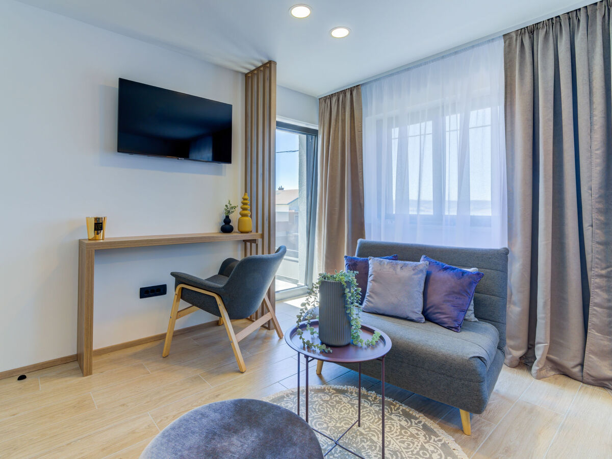 Rénovée en 2022, aménagement moderne et de bon goût: séjour/salle à manger avec 1 divan-lit (180 cm, longueur 200 cm), TV (satellite).