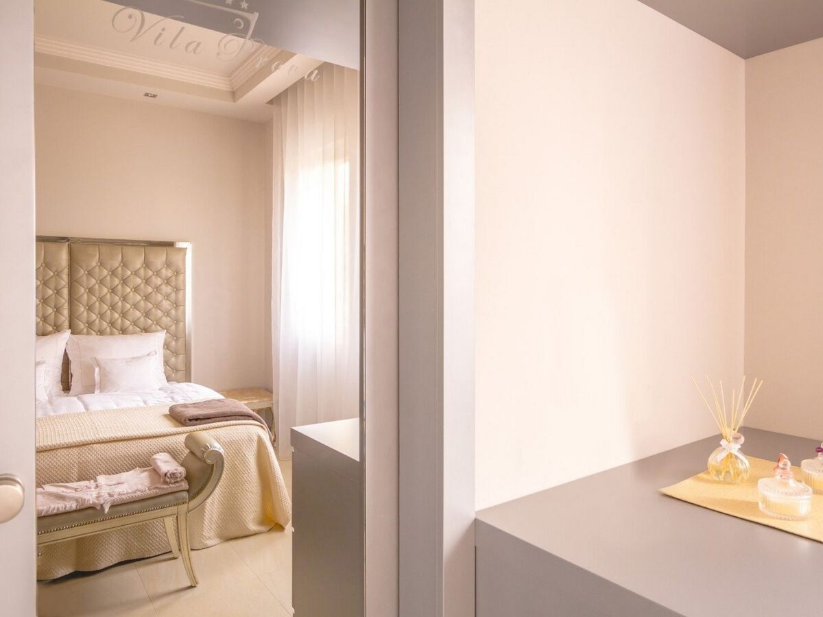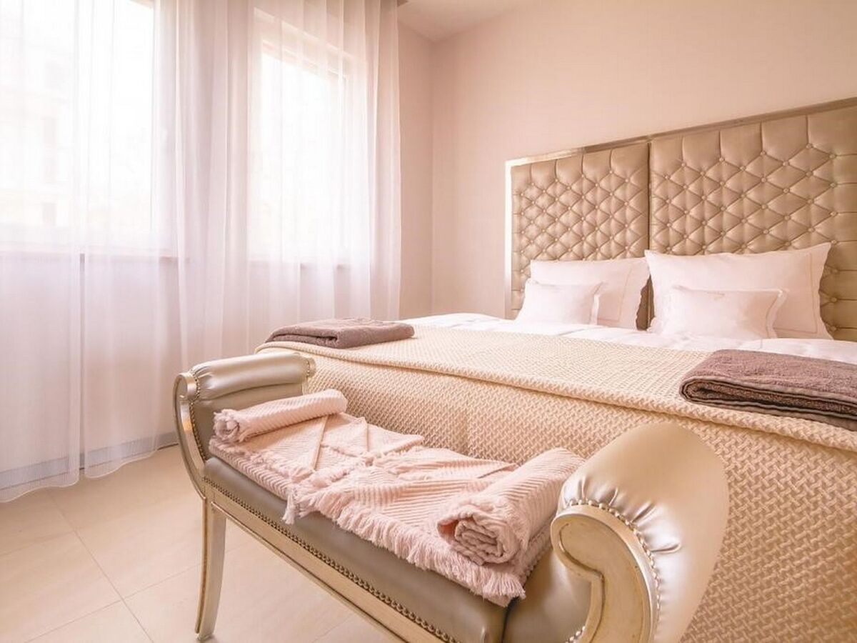 1 chambre avec 1 lit double (2 x 90 cm, longueur 200 cm), bain/WC et double vasque.