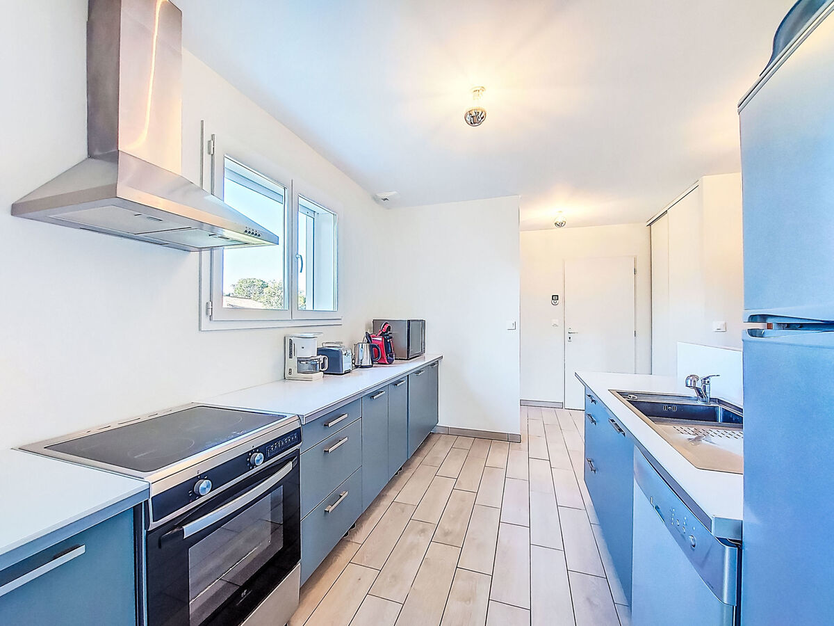 Cuisine ouverte (four, lave-vaisselle, 3 plaques à induction, grille-pain, bouilloire électrique, micro-ondes, congélateur, cafetière électrique).