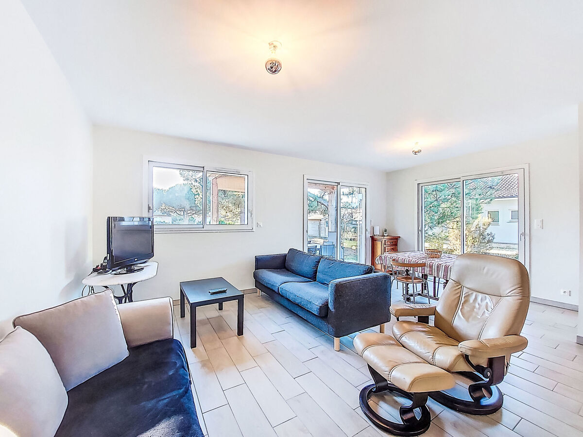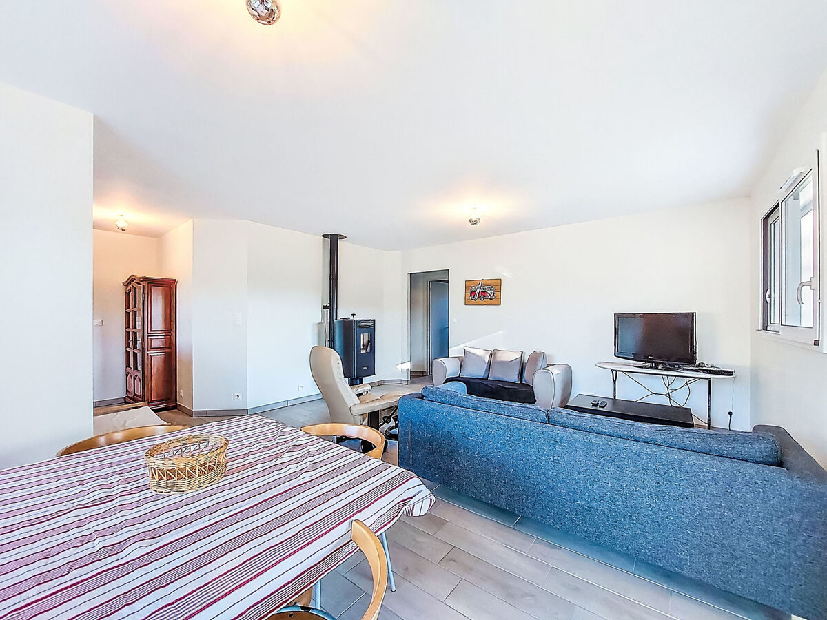 Clair, aménagement fonctionnel: séjour/salle à manger avec table pour les repas et TV (écran plat).
