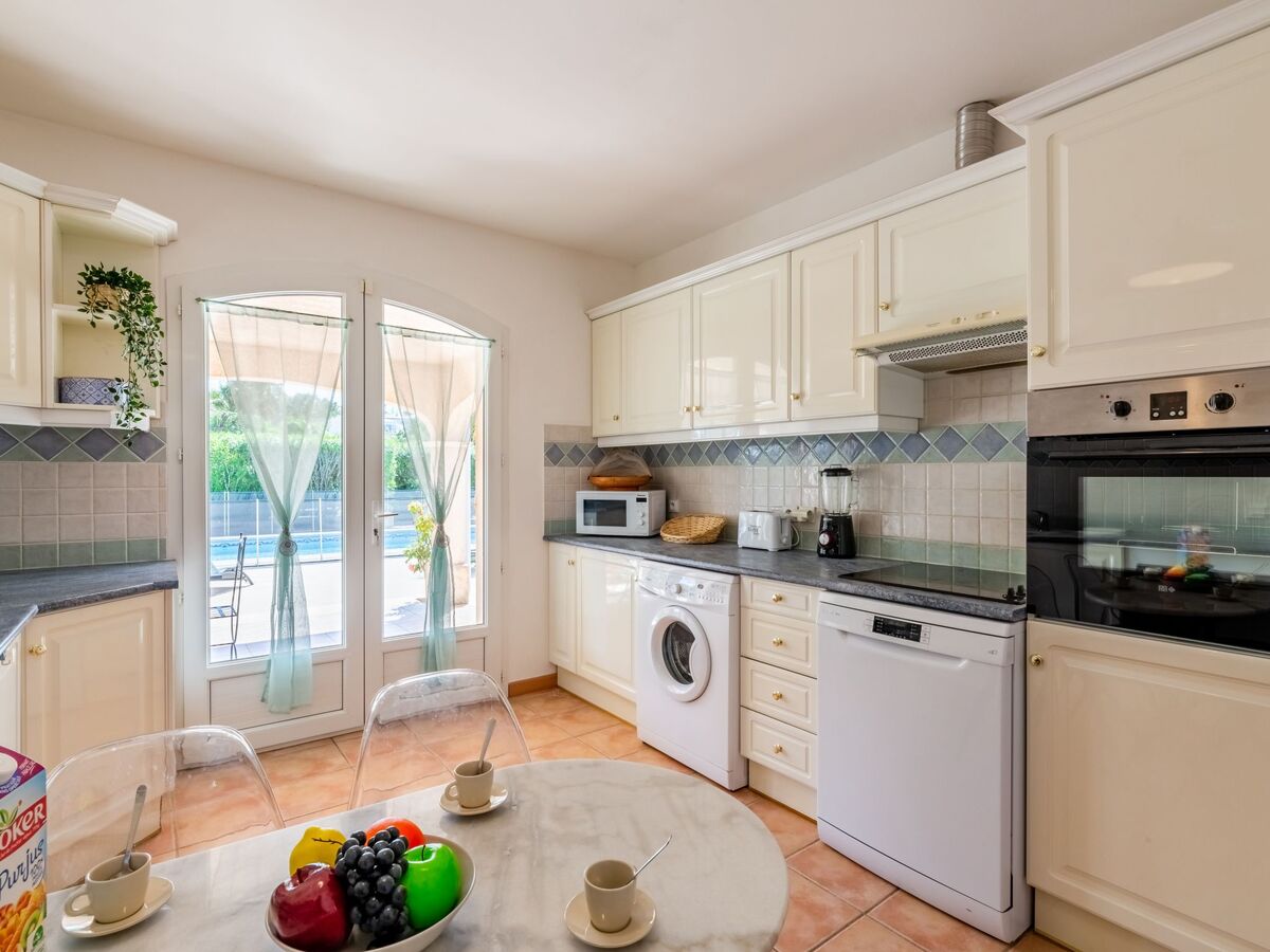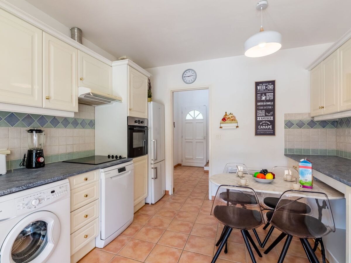 Grande cuisine (four, lave-vaisselle, 4 plaques vitrocéramiques, grille-pain, bouilloire électrique, micro-ondes, congélateur, cafetière électrique) avec petite table pour les repas.