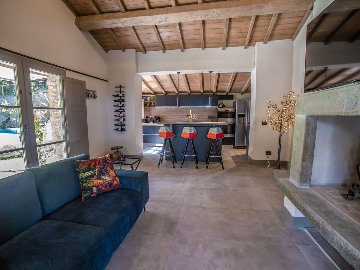 Aménagement moderne et luxueux: séjour avec cheminée, coin repas, coin-cuisine et TV (satellite) (écran plat).
