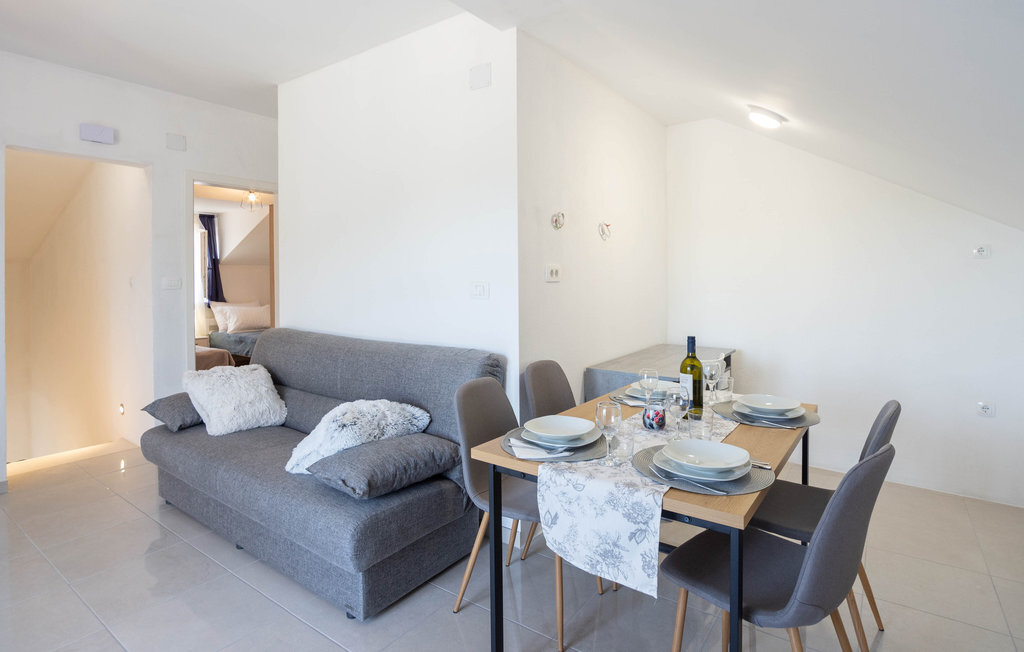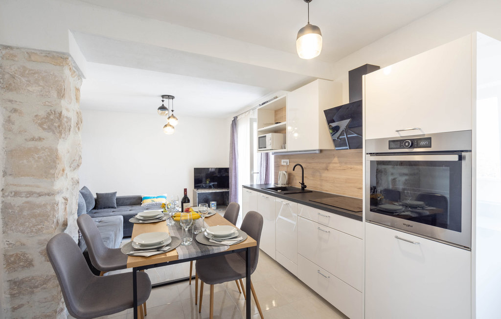 Cette belle et lumineuse maison de vacances avec sa grande terrasse sur le toit, qui vous offre une vue fascinante sur la mer bleue cristalline, a été entièrement rénovée et aménagée avec style. Vous pourrez y prendre votre petit déjeuner pendant des heures, observer les couchers de soleil ou vous retirer sur l'un des canapés des deux salons.