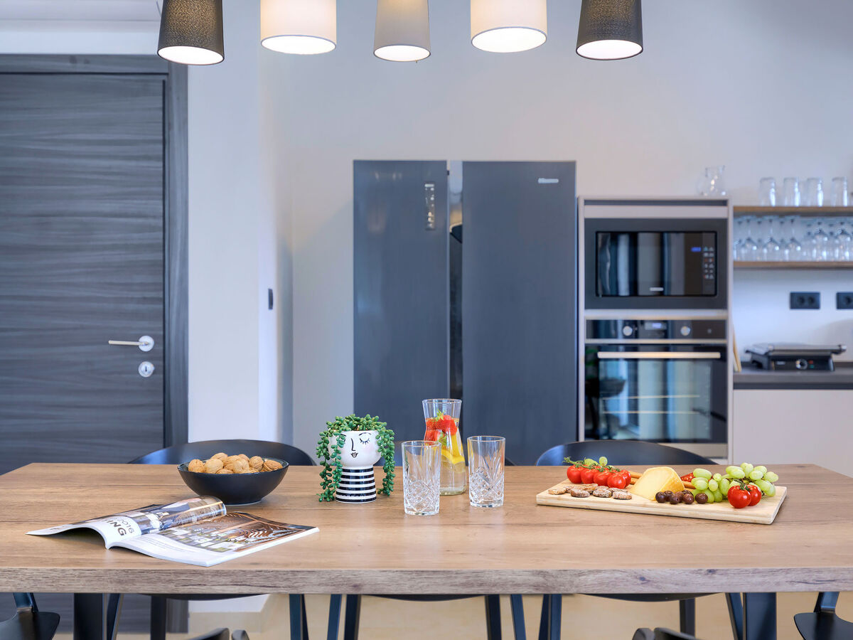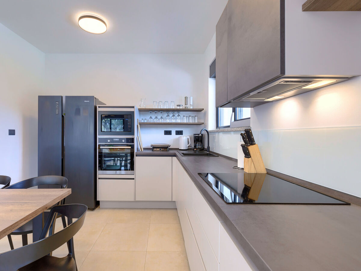 Cuisine ouverte (four, lave-vaisselle, 4 plaques vitrocéramiques, bouilloire électrique, micro-ondes, congélateur, cafetière électrique).