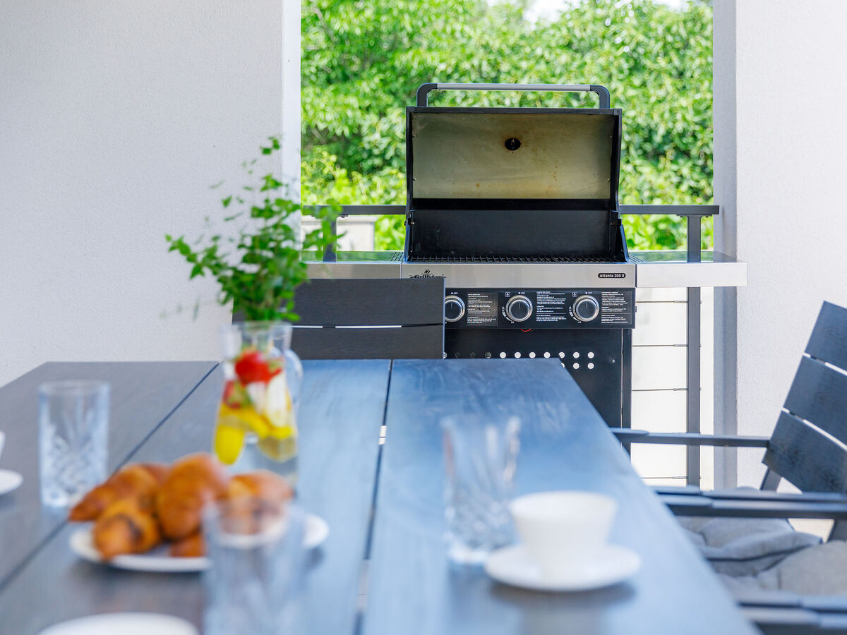 Meubles de terrasse, barbecue (portable), chaises longues.