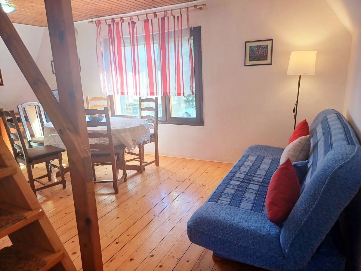 Sous le toit: (escalier raide) chambre avec passage mansardée, ouverte, - 230 cm avec 1 lit double (2 x 90 cm, longueur 200 cm).