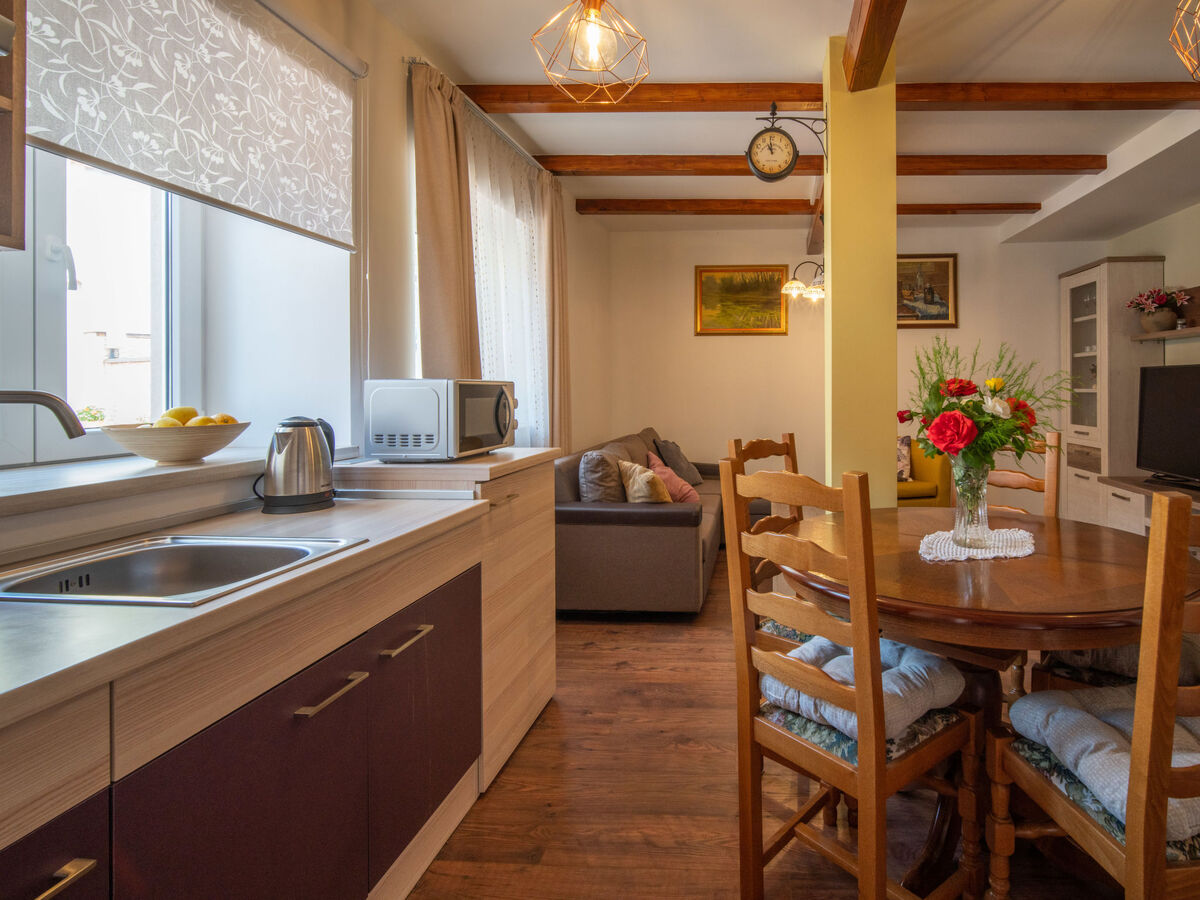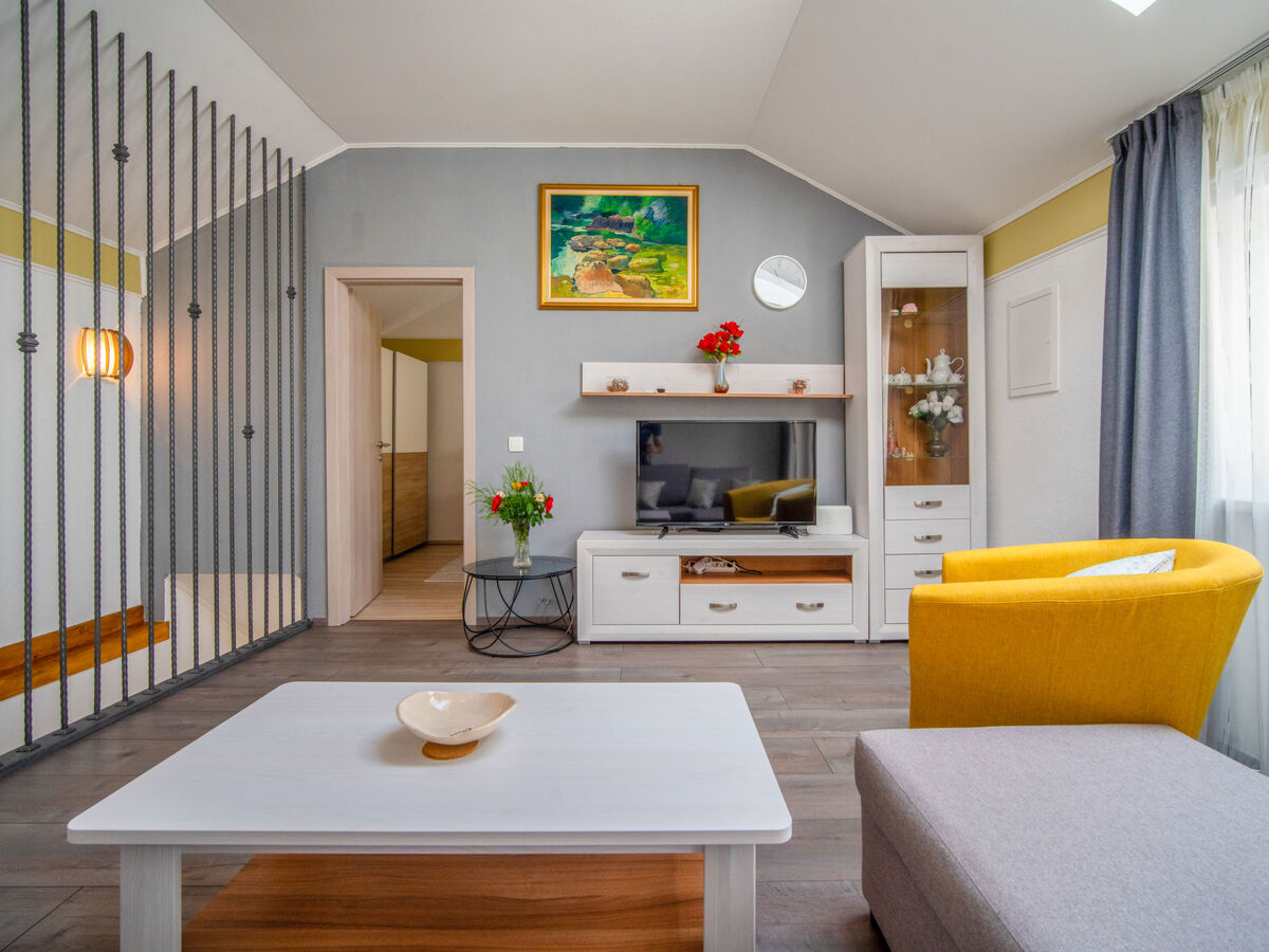 Séjour/salle à manger avec 1 divan-lit (120 cm, longueur 190 cm), coin-cuisine et TV (satellite) (écran plat), air-conditionné.