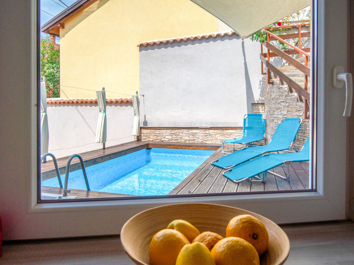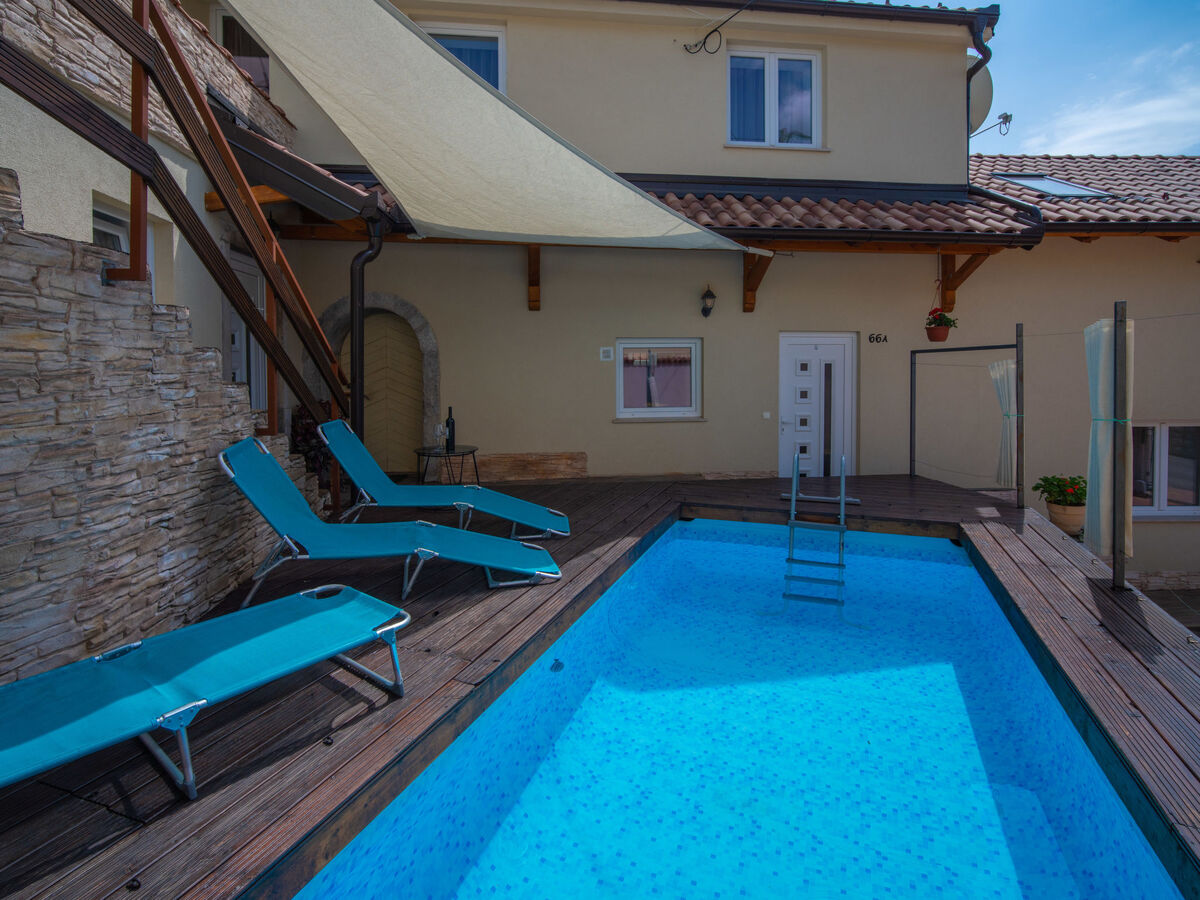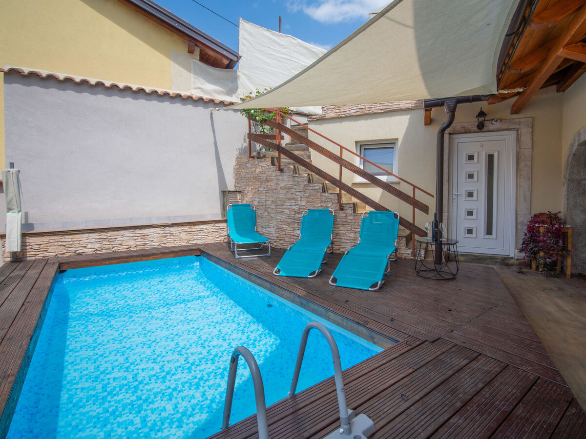 A usage privé: terrain 480 m2 (clôturé), piscine rectangulaire (4 x 2 m, 9 m2, profondeur 120 cm, disponibilité saisonnière: 01.Mai.