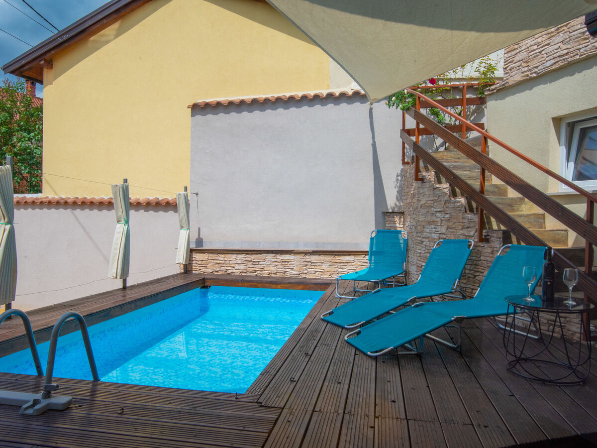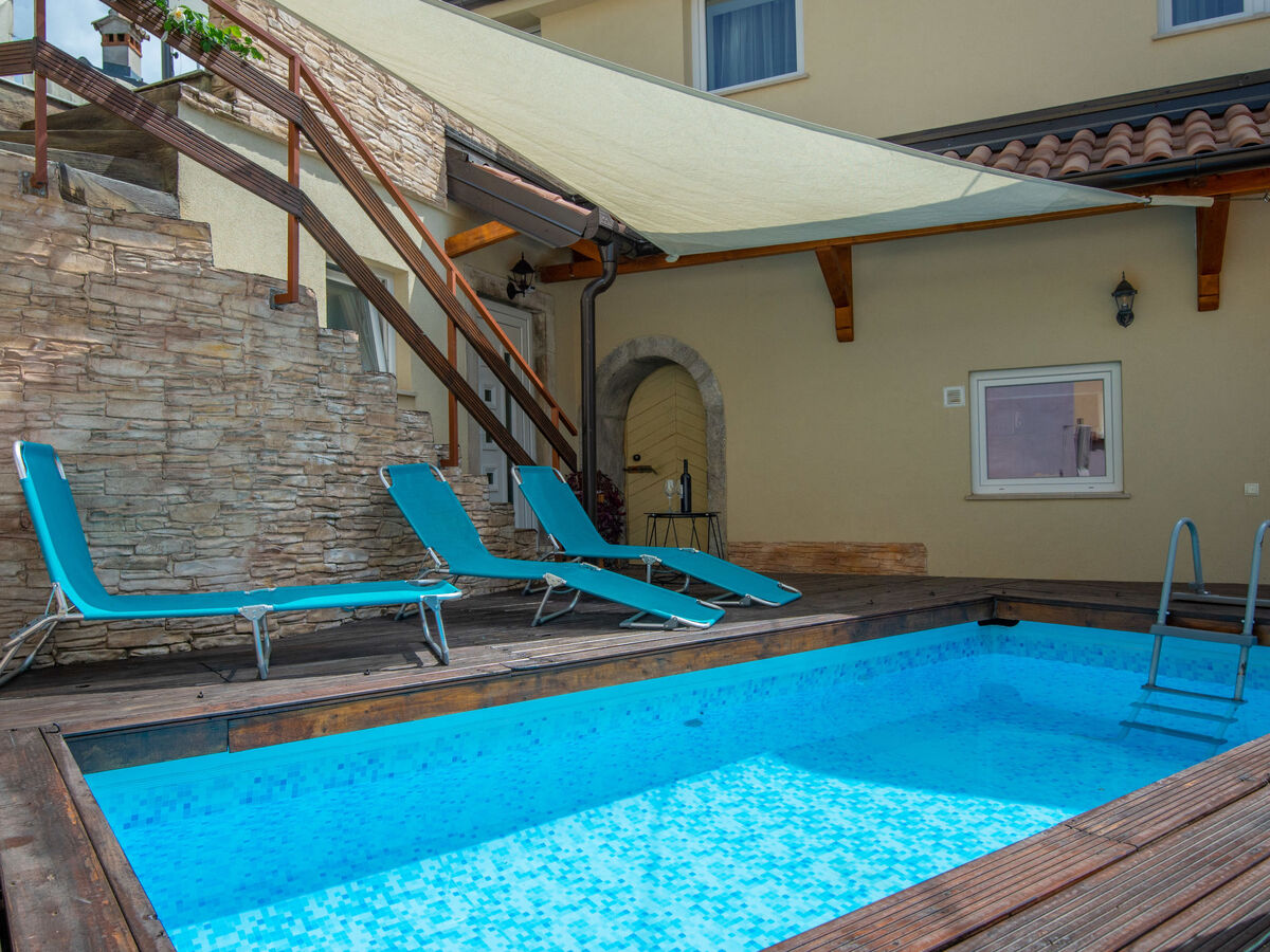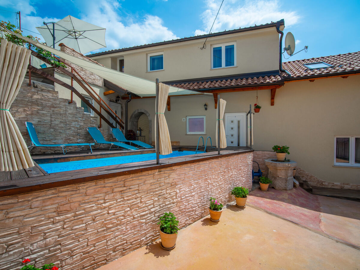 A usage privé: terrain 480 m2 (clôturé), piscine rectangulaire (4 x 2 m, 9 m2, profondeur 120 cm, disponibilité saisonnière: 01.Mai.