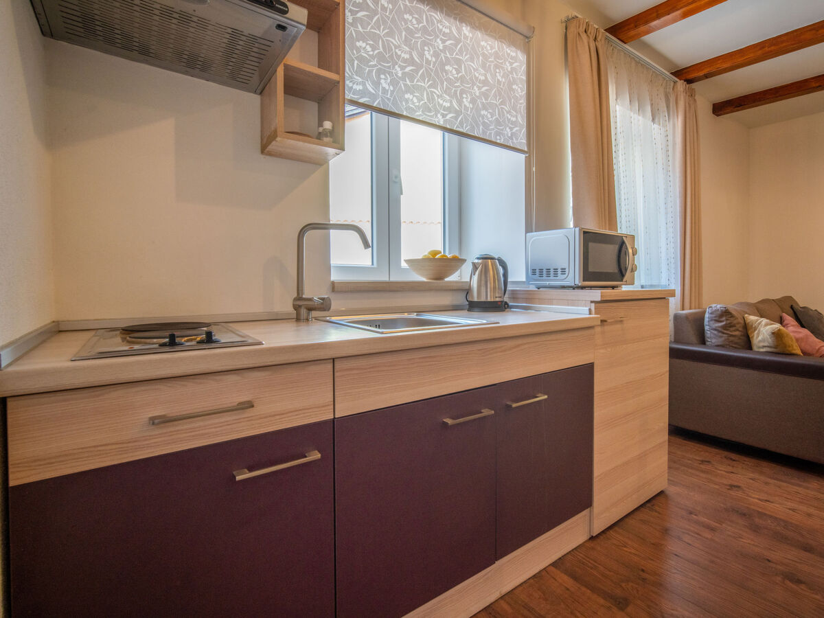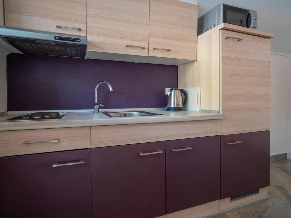 Cuisine ouverte (2 plaques de cuisson, micro-ondes, cafetière électrique).