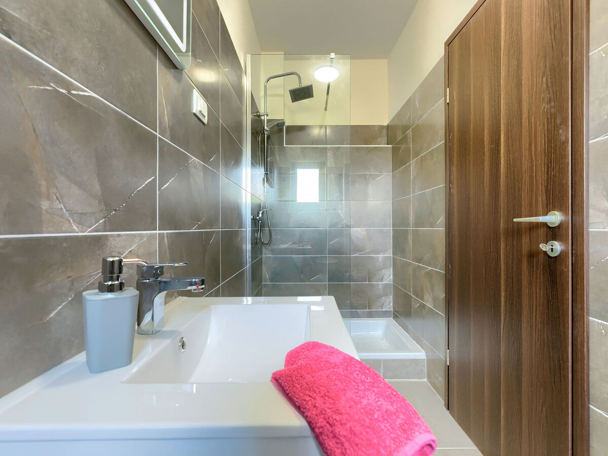 Douche/WC dans l'espace piscine, terrasse (15 m2), meubles de jardin.