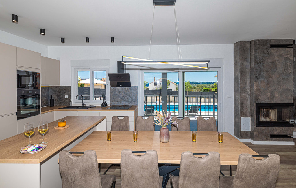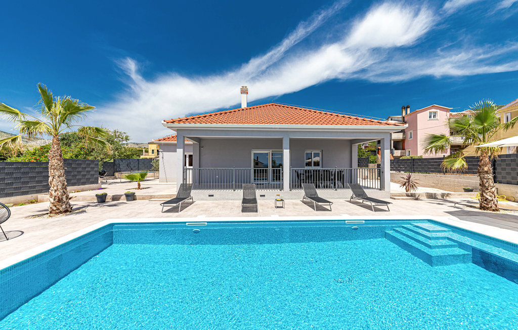 Cette magnifique maison avec sa piscine turquoise et sa grande terrasse carrelée avec un toit, des parasols et des palmiers, vous permet de vous détendre immédiatement. Après vous être rafraîchi dans la piscine et avoir bu une boisson fraîche à l'ombre, vous serez certainement prêt à partir à la découverte des villes environnantes et de la magnifique nature de la Dalmatie.