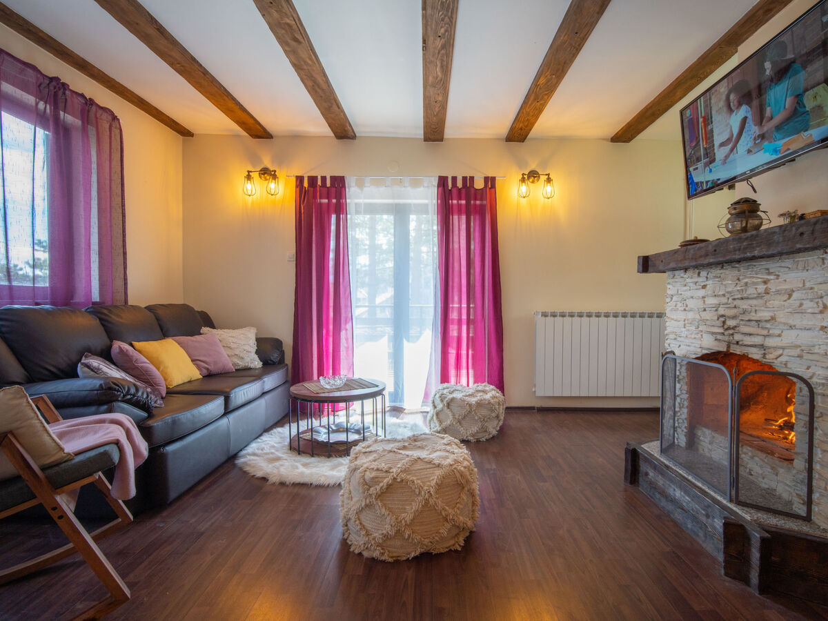 Séjour avec 1 divan-lit double (140 cm, longueur 190 cm), cheminée (uniquement à titre de décoration), TV.