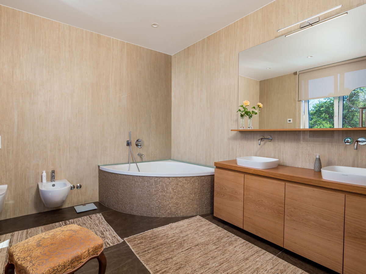 À l'étage supérieur: 1 chambre avec 1 grand-lit (180 cm, longueur 200 cm), bain/bidet/WC et air-conditionné.