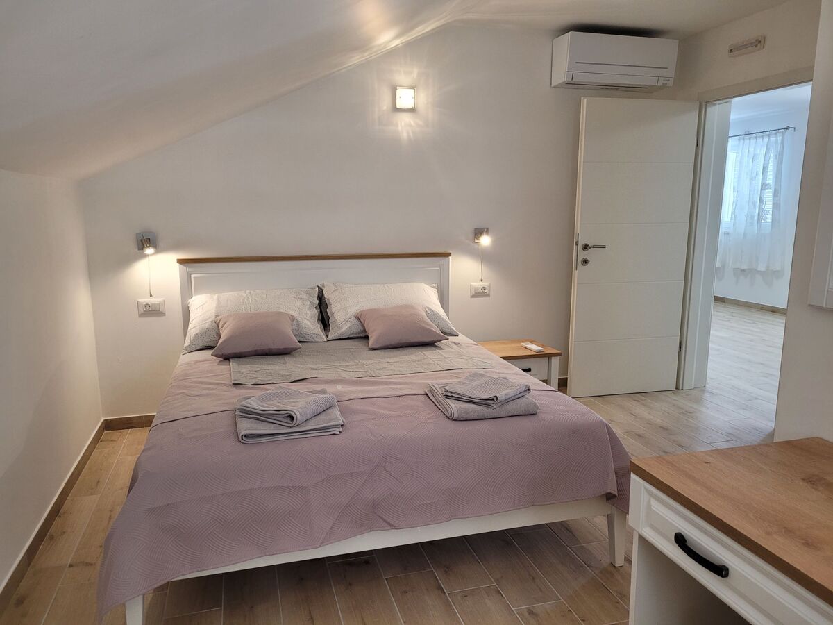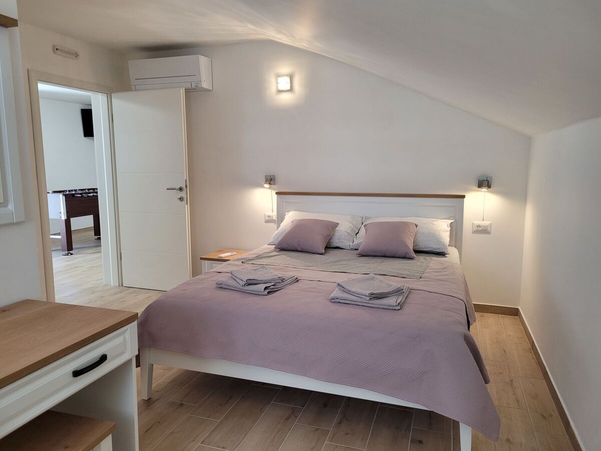 2 chambres, mansardées hauteur plafond 150 - 230 cm, chaque chambre avec: 1 grand-lit (160 cm, longueur 200 cm), douche/WC et air-conditionné.