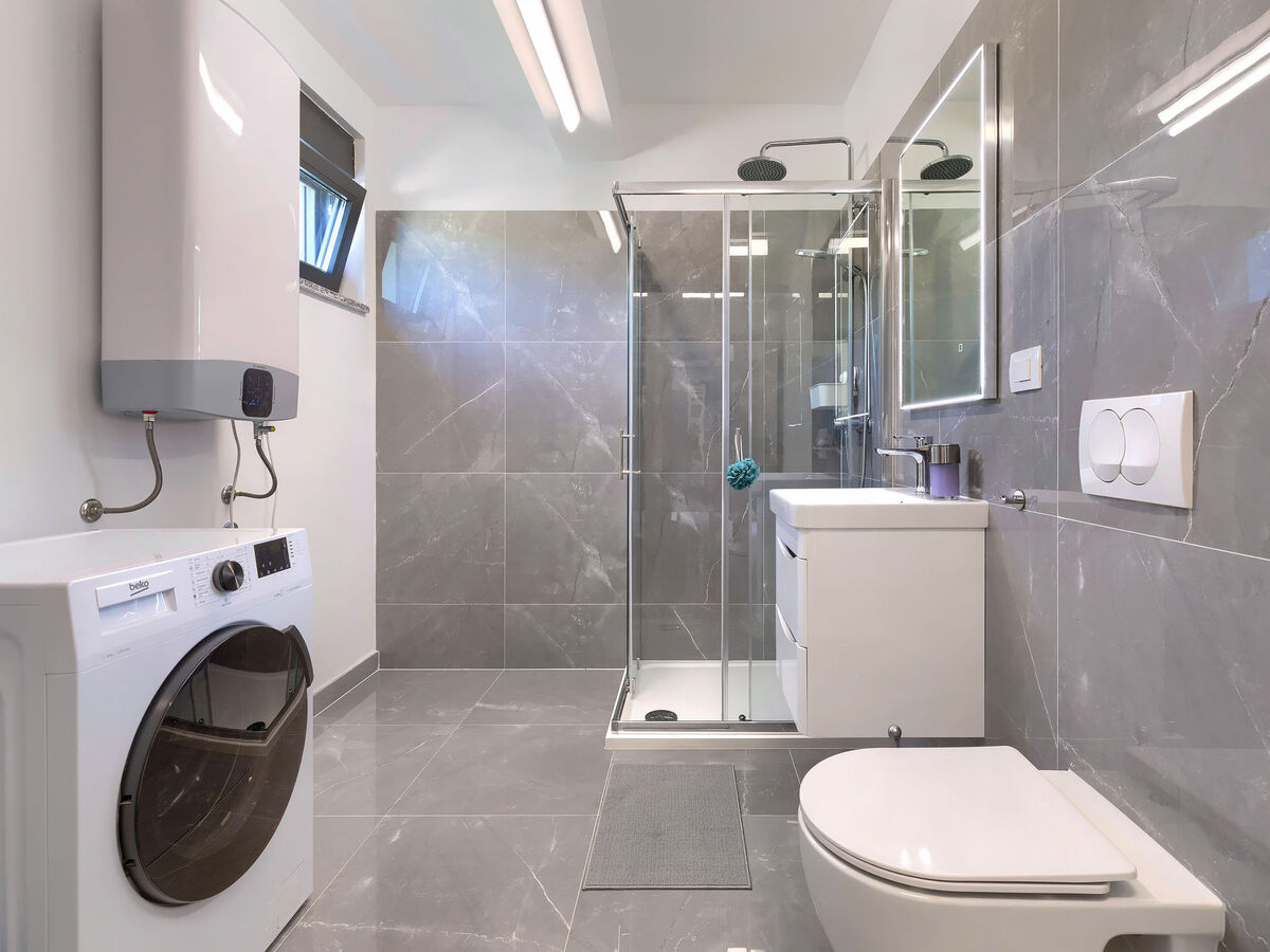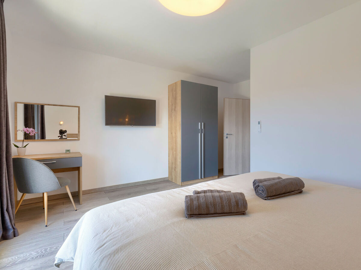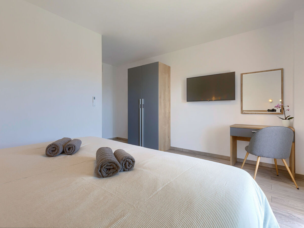 À l'étage supérieur: 2 chambres, chaque chambre avec: 1 grand-lit (180 cm, longueur 200 cm), douche/WC et TV (satellite) (écran plat), air-conditionné.