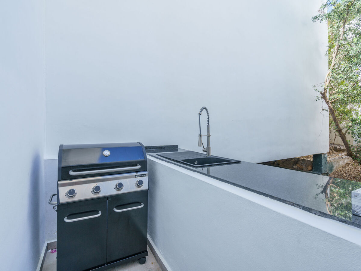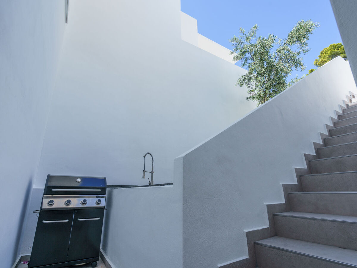 Meubles de terrasse, barbecue, chaises longues, place pour s'asseoir.