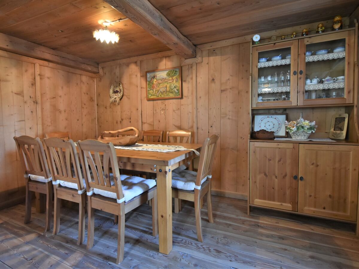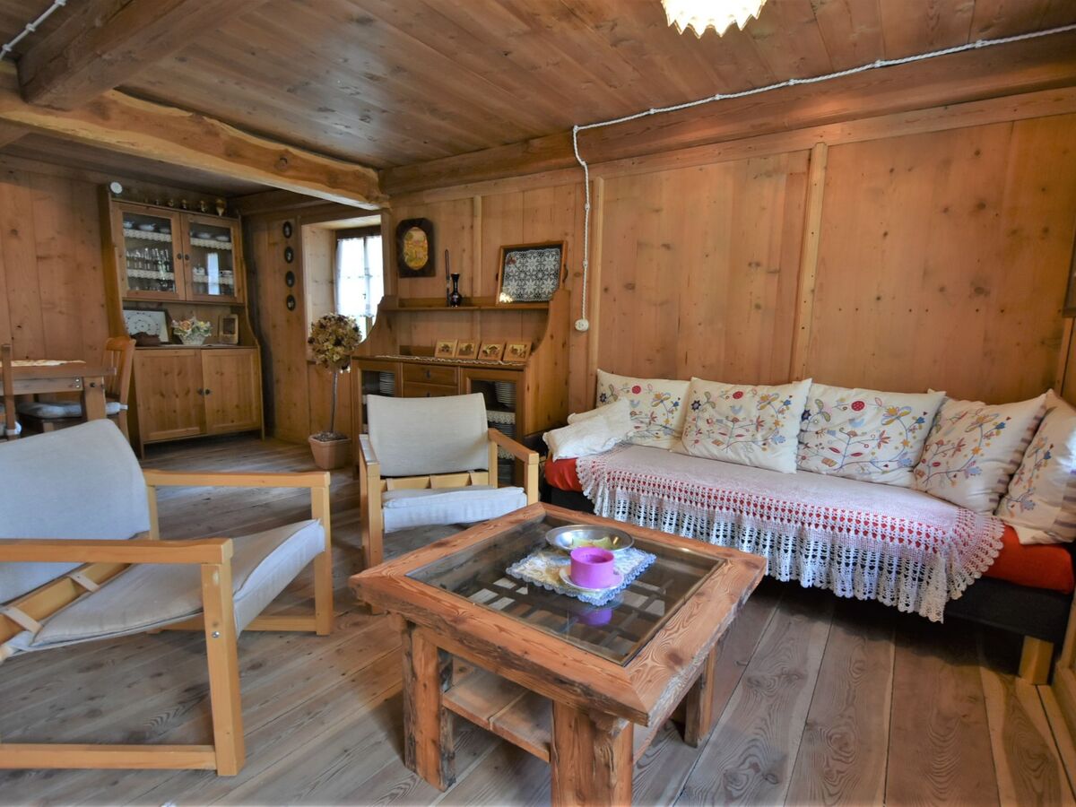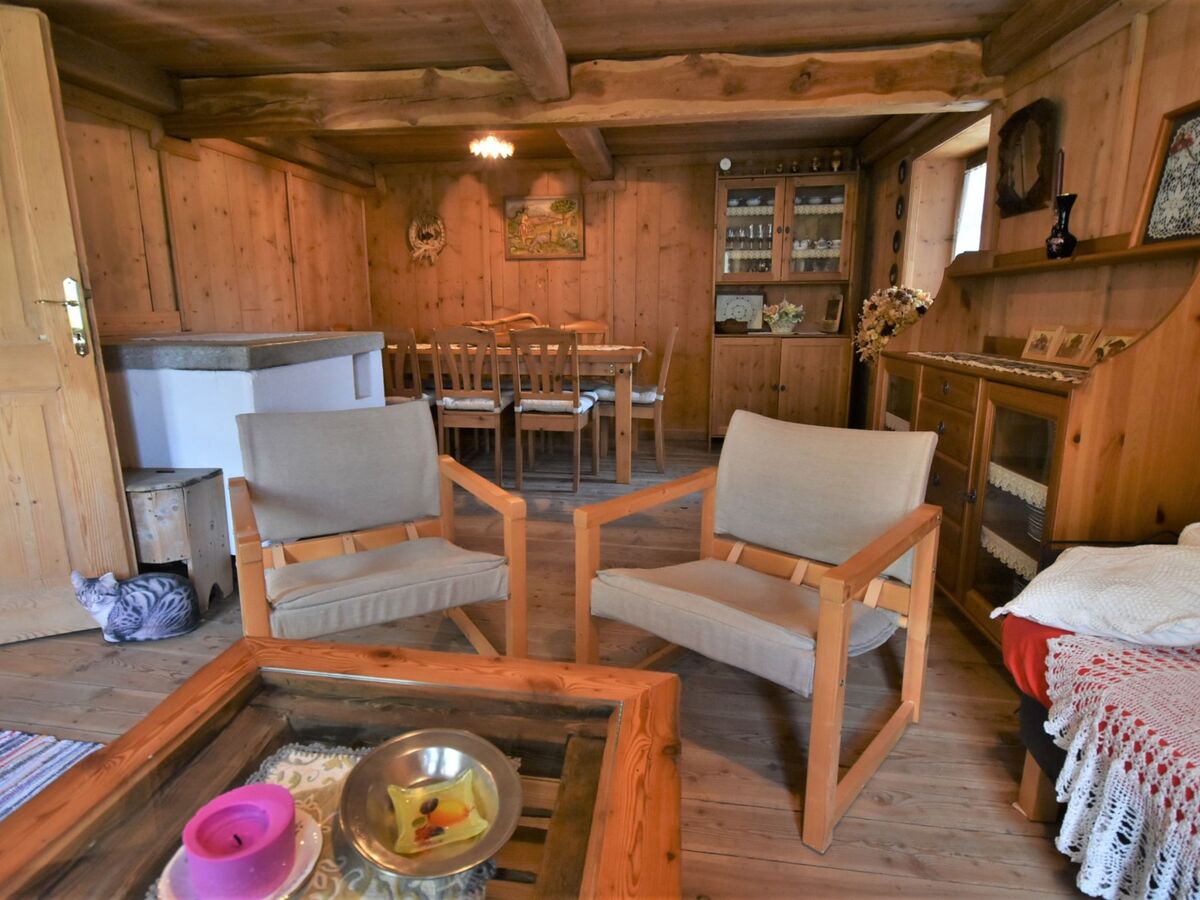 Partiellement mansardée, rénovée en 2021, aménagement rustique et avec beaucoup de bois: séjour/salle à manger hauteur plafond 190 - 205 cm avec table pour les repas et TV (écran plat), radio et poêle à bois.
